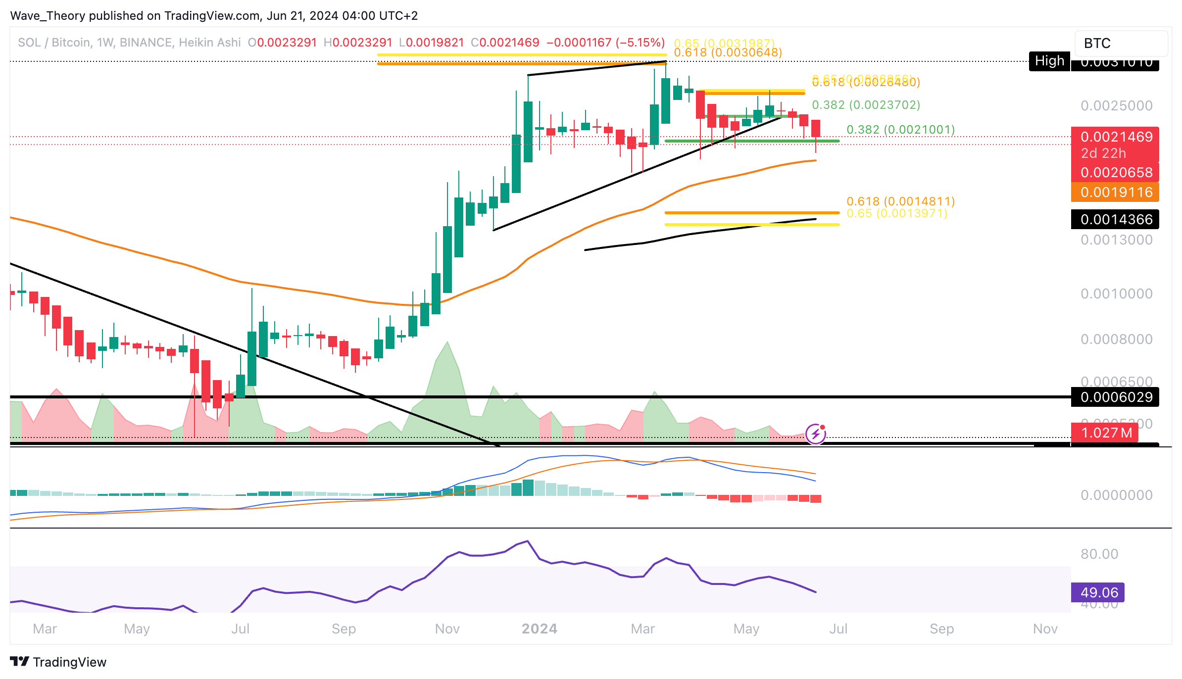 Gegen Bitcoin wurde der SOL Kurs vor einigen Wochen am Golden Ratio Widerstand bei rund 0,00268 BTC bärisch abgewiesen. Damit stößt der SOL Kurs jetzt auf signifikante 0,382 Fib Unterstützung bei rund 0,0021 BTC, woran der Kurs bullisch abprallen könnte.