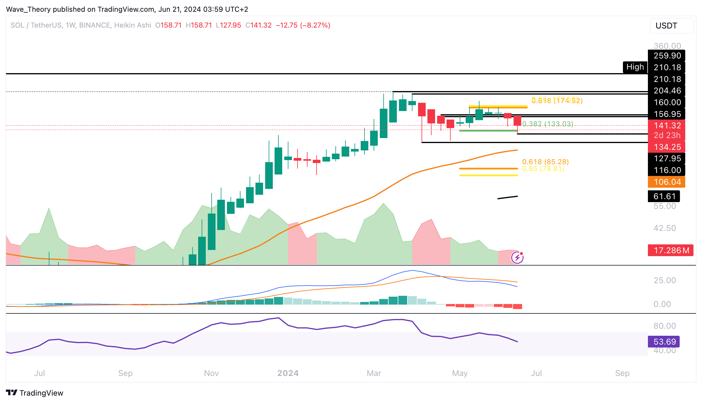 Nicht zu leugnen ist die Tatsache, dass Solana im März einen lokalen Hochpunkt erreicht hat und sich seither in einer Abwärtsbewegung befindet. Durch das Scheitern am Golden Ratio Widerstand bei rund 175 USD sieht es mittelfristig nach einer Fortsetzung der Korrekturbewegung aus.