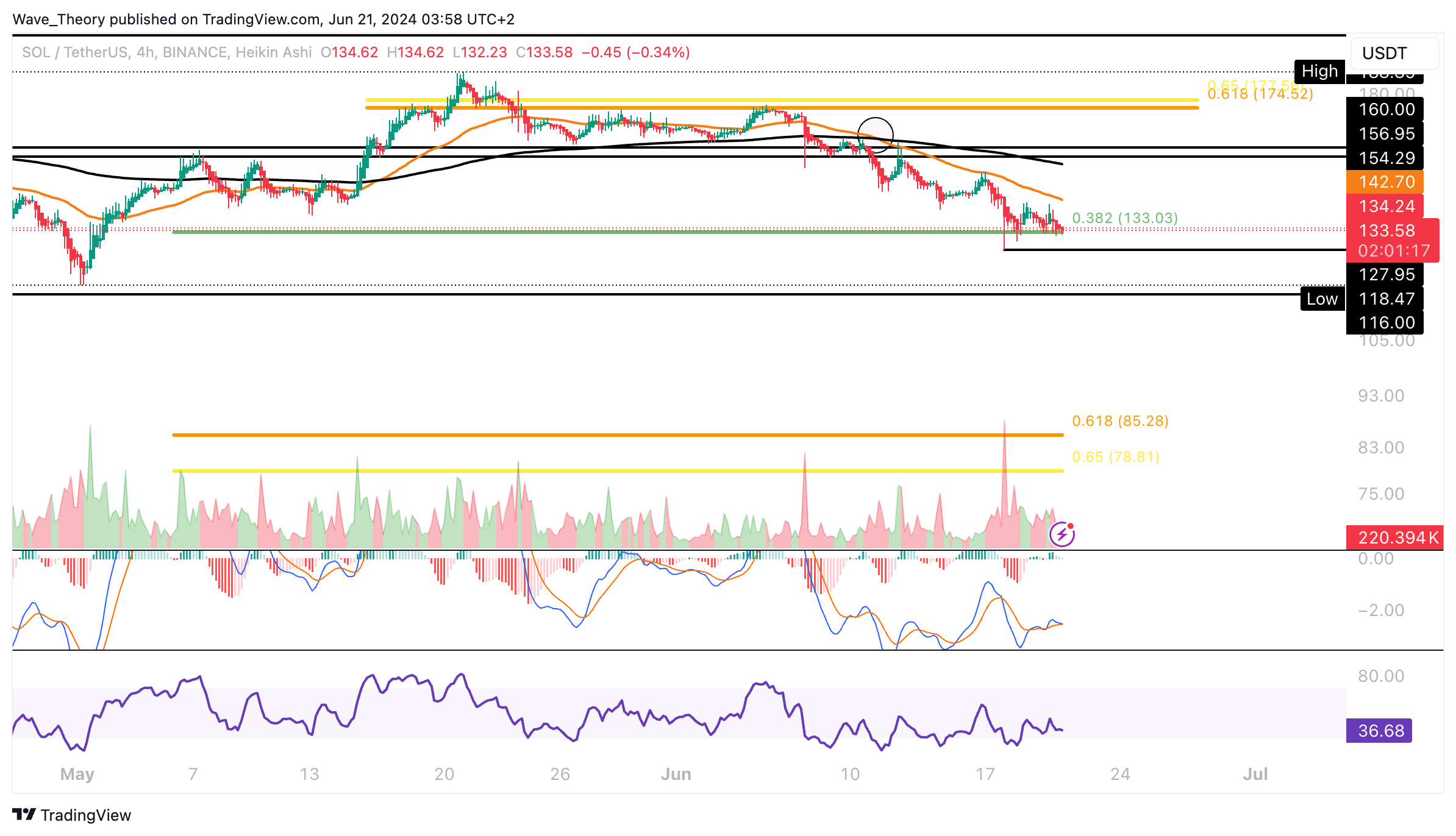 Der SOL Kurs hat jetzt die 0,382 Fib Unterstützung bei rund 133 USD erreicht. Darüber hinaus fungiert der 200-Tage-EMA bei rund 130 USD als zusätzliche Unterstützung.