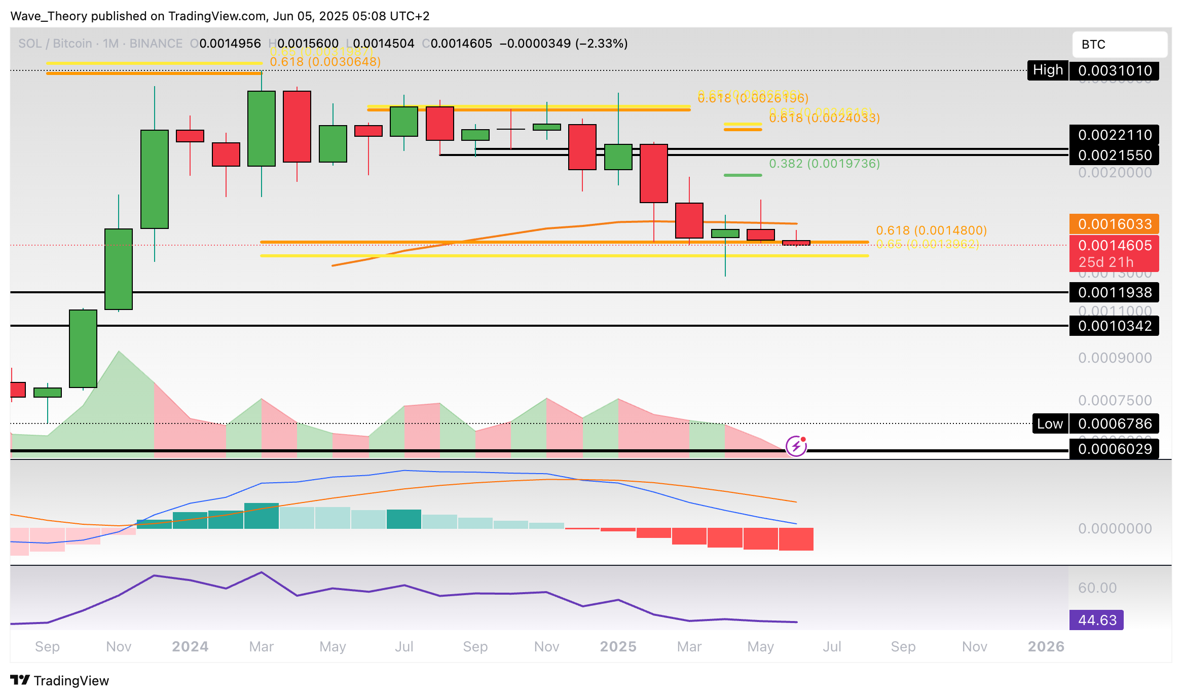 Sollte Solana dennoch bullisch abprallen und den 50-Monate-EMA Widerstand brechen, wartet spätestens bei rund 0,001973 BTC der nächste signifikante Widerstand auf Solana.