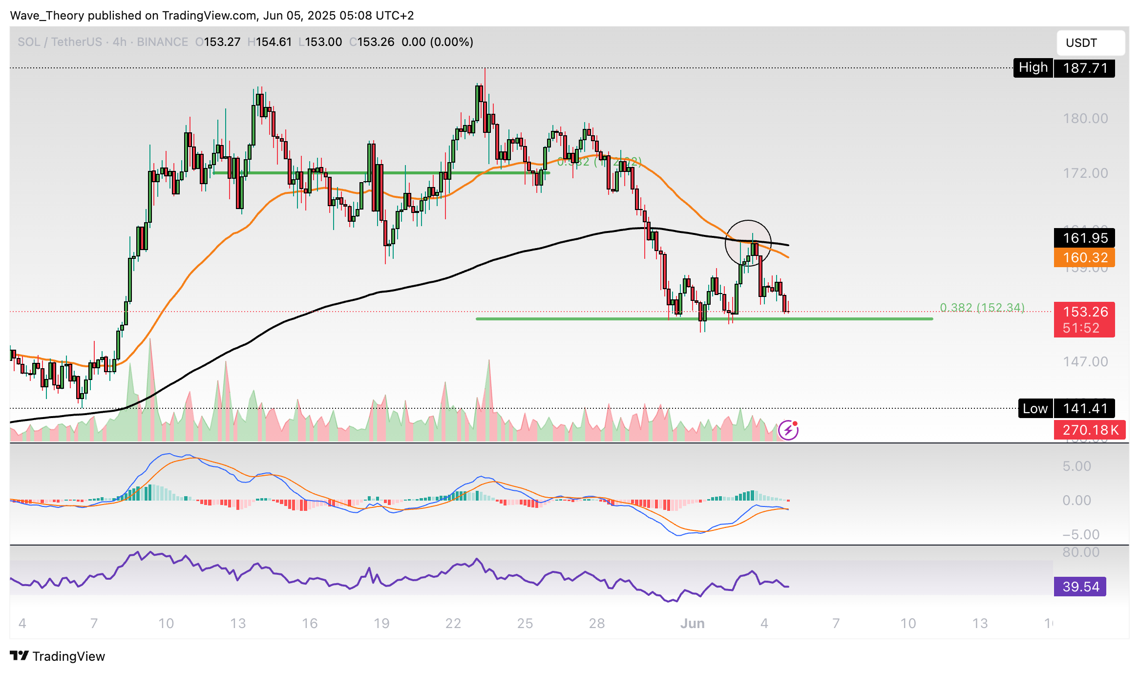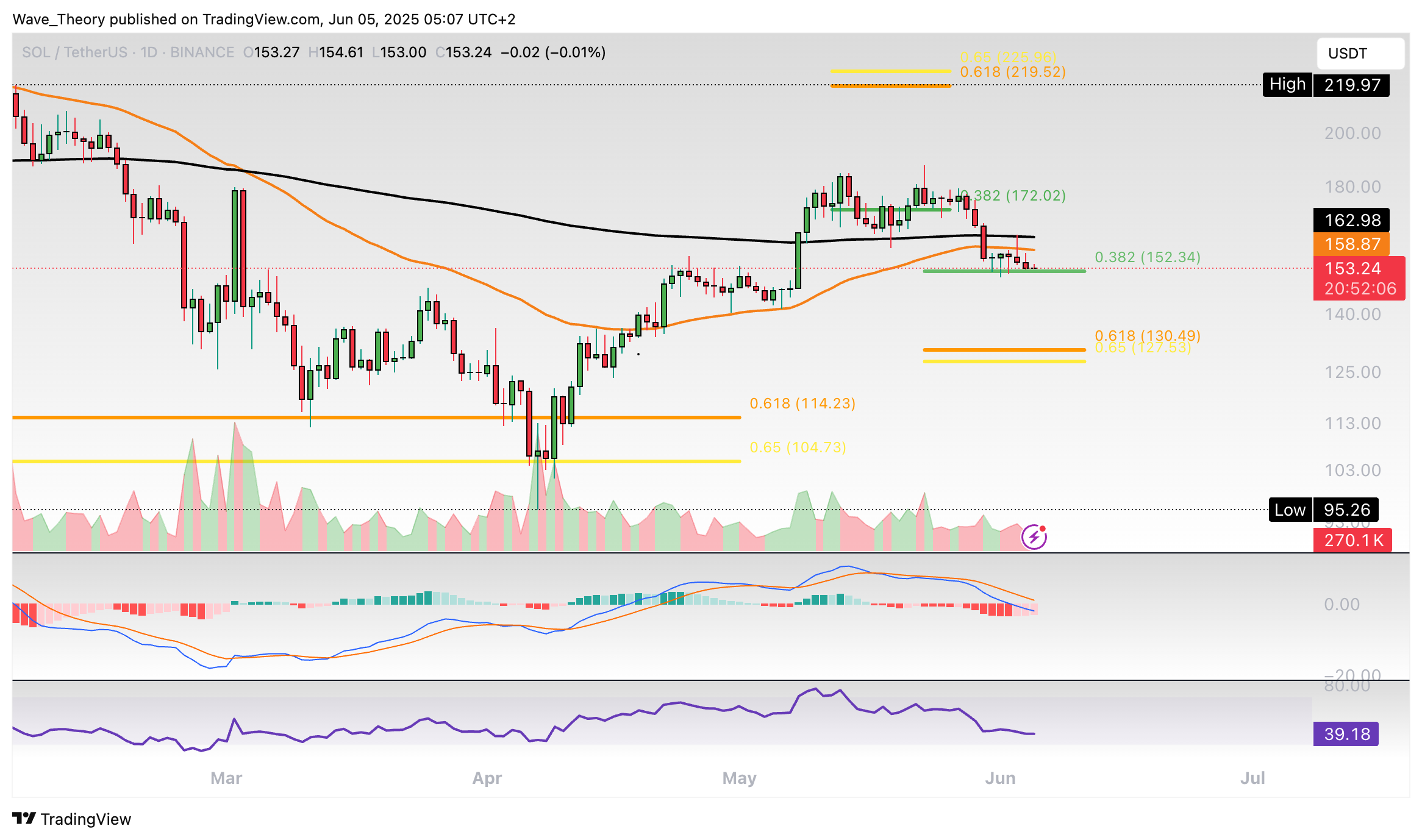Der Solana Kurs stößt jetzt am 0,382 Fib Niveau bei rund 152 USD auf Unterstützung