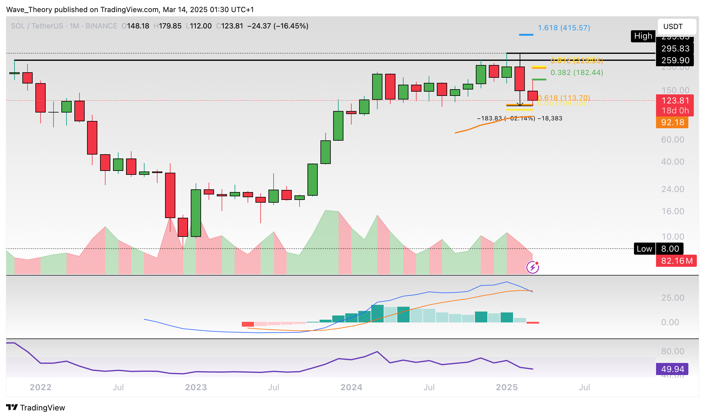 Solana ist in den letzten drei Monaten rund 62 % gefallen und hat damit jetzt signifikante Golden Ratio Unterstützung bei rund 110 USD erreicht. Sollte diese Unterstützung nicht halten, wartet bei rund 92 USD die nächste signifikante Unterstützung am 50-Monate-EMA.