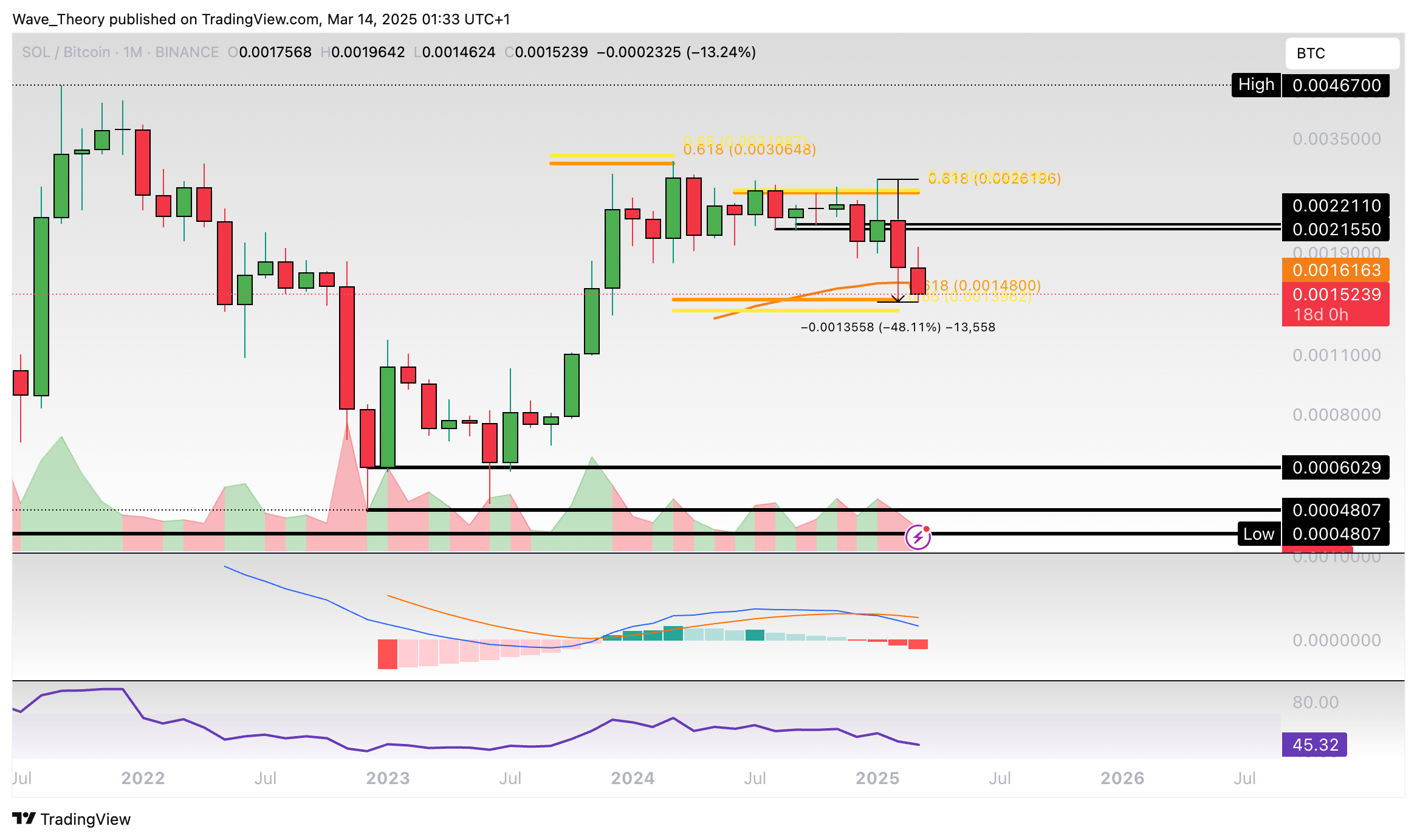 Gegen Bitcoin hat Solana in diesem Monat erneut die Golden Ratio Unterstützung bei rund 0,00148 BTC erreicht, woran der Kurs bullisch abprallen könnte.