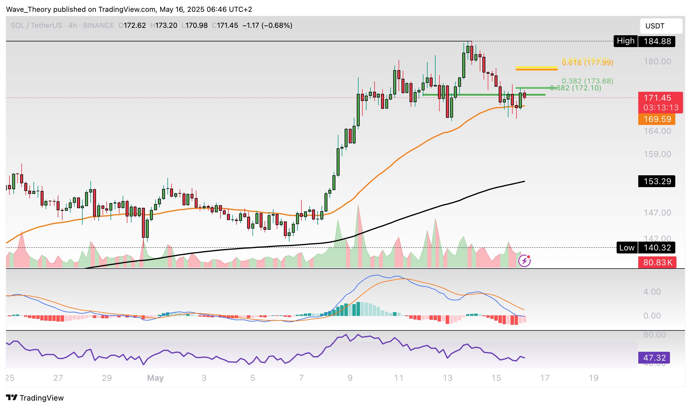 Der Solana Kurs konnte den 0,382 Fib Widerstand bei rund 172 USD brechen