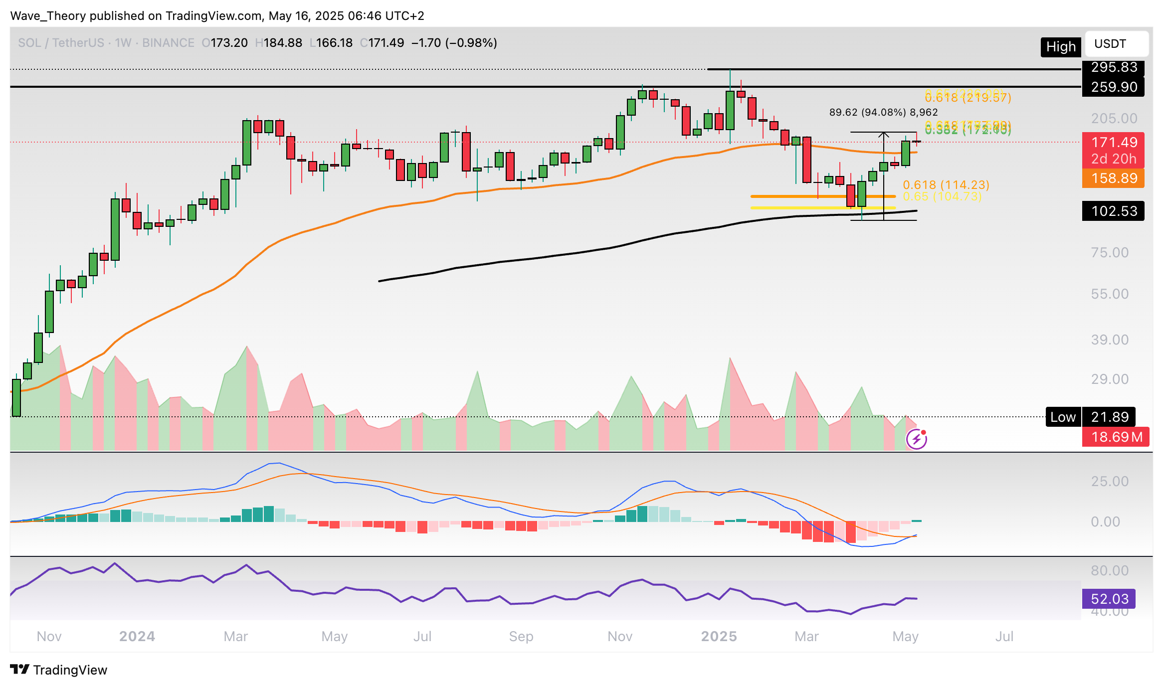 Solana-Prognose für Freitag. 16. Mai: Der Solana Kurs hat kritischen Widerstand gebrochen. Wird Solana damit zum Golden Ratio Niveau steigen können?