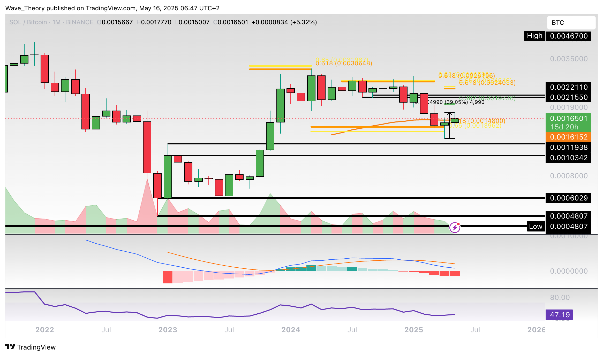 Sollte Solana dennoch weitersteigen und den 50-Monate-EMA Widerstand hinter sich lassen, wartet spätestens bei rund 0,001973 BTC der nächste signifikante Widerstand auf SOL.