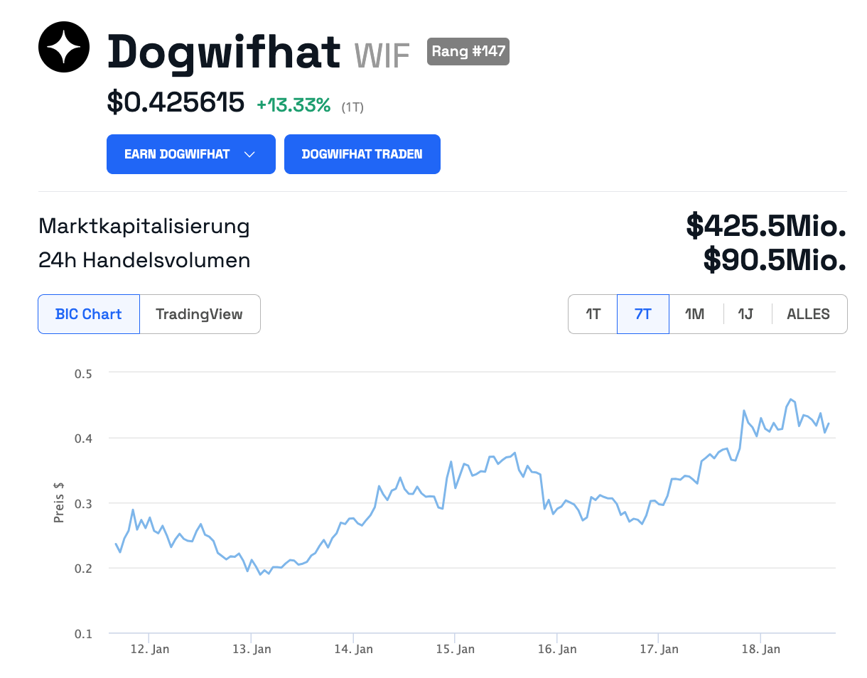 KuCoin notierte den Token nur etwa eine Stunde früher und so verhalfen die beiden Krypto Börsen WIF zu einem neuen Allzeithoch von 0,5317 US-Dollar. Aktuell hält WIF sich bei etwa 0,4256 USD, was noch immer einem Anstieg von über 13 Prozent in den letzten 24 Stunden entspricht.
