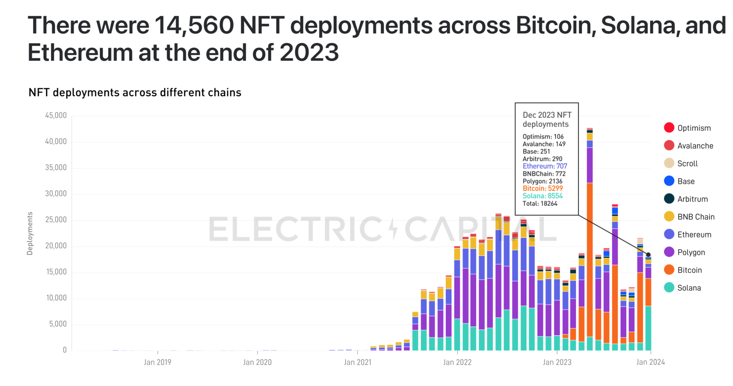 Dem aktuellen Bericht zufolge dominieren die beiden Neuheiten den Markt bei weitem. Im Dezember 2023 wurden insgesamt 14.560 NFTs auf Ethereum, Bitcoin und Solana implementiert, davon mit Abstand die meisten (8.554) auf Solana, 5299 auf Bitcoin und lediglich 707 auf Ethereum.