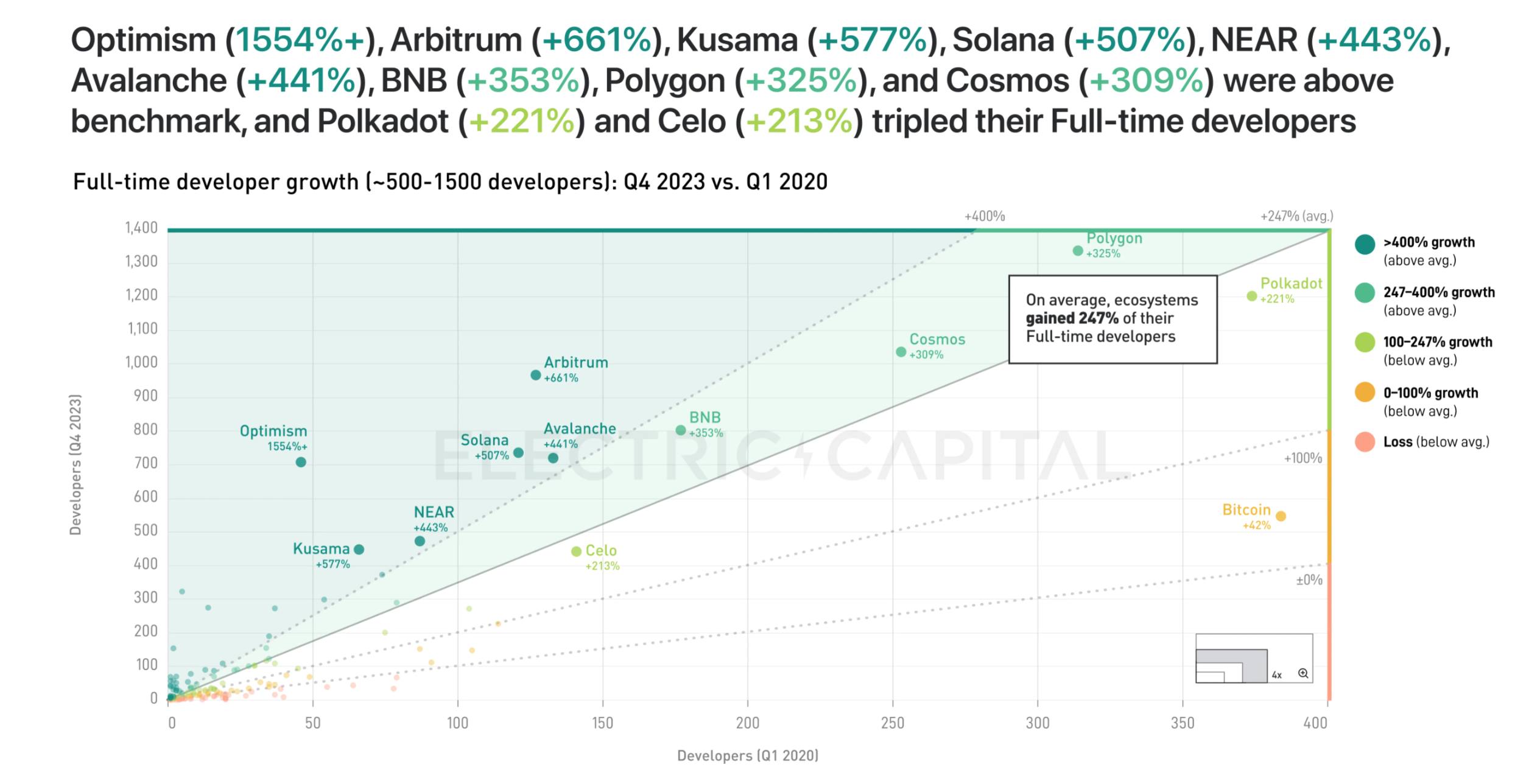 Am 17. Januar 2024 veröffentlichte Electric Capital den Crypto Developer Report 2023. Dieser gewährte durch die Analyse von 485 Millionen Code-Commits (Fehlerbehebungen, Aktualisierungen und Neuimplementierungen) in 818.000 Open Source Repositories einen tiefen Einblick in die Welt der Blockchain Branche.