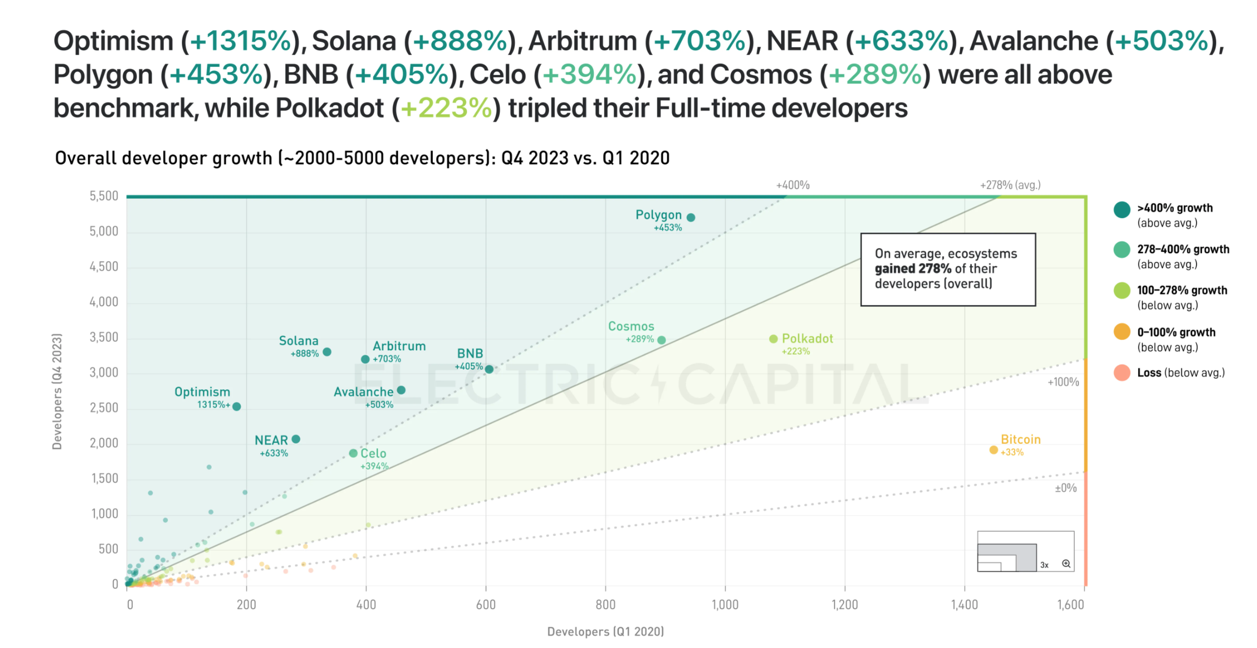 Mit etwa 3.200 Entwickler:innen und einem Wachstum von 703 Prozent kommt Arbitrum nur knapp hinter Solana. An vierter Stelle steht NEAR mit etwas über 2.000 Entwickler:innen, ein Zuwachs von 633 Prozent, und an fünfter Stelle Avalanche etwa 2.800 Entwickler:innen – ein Wachstum von 503 Prozent.