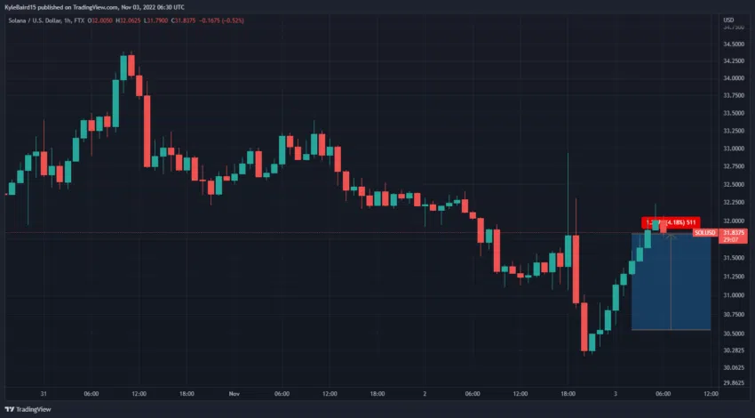 Der native Solana-Token SOL erholte sich nach dieser Nachricht leicht und stieg seitdem um etwas mehr als 4 %. Infolge der gestrigen Zinserhöhung durch die Federal Reserve erreichte SOL einen Preis von 32,72 US-Dollar, fiel jedoch in den darauffolgenden Stunden stark ab.