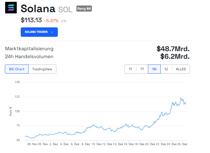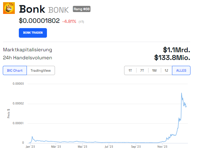 Ein Grund für die Rallye von BONK ist wohl auch der aktuelle Solana Kurs Anstieg. Erst kürzlich erreichte der SOL Preis mit über 120 US-Dollar ein neues Jahreshoch, korrigierte dann jedoch etwas. Damit ist der Kurs nur noch etwas über 50 % von dem letzten Allzeithoch entfernt.