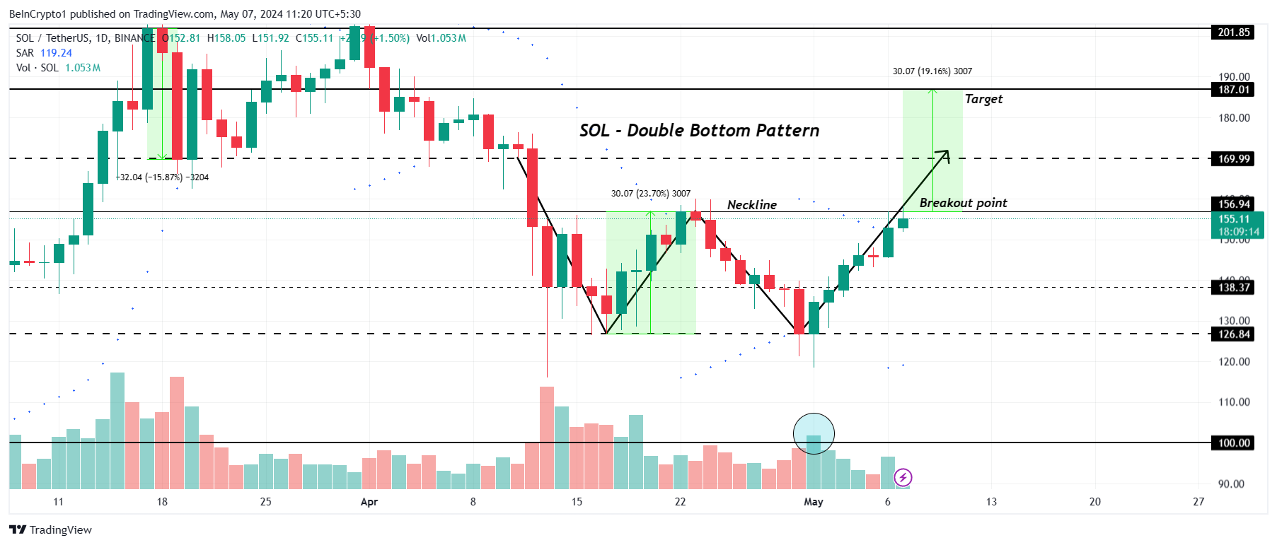 Ein solches Muster ist ein bullisches Umkehrsignal, das von zwei aufeinanderfolgenden Tiefs auf gleicher Kurshöhe gebildet wird. Basierend auf dem Muster liegt das wahrscheinliche Ziel für das Aufwärtspotenzial von SOL bei 187 USD.