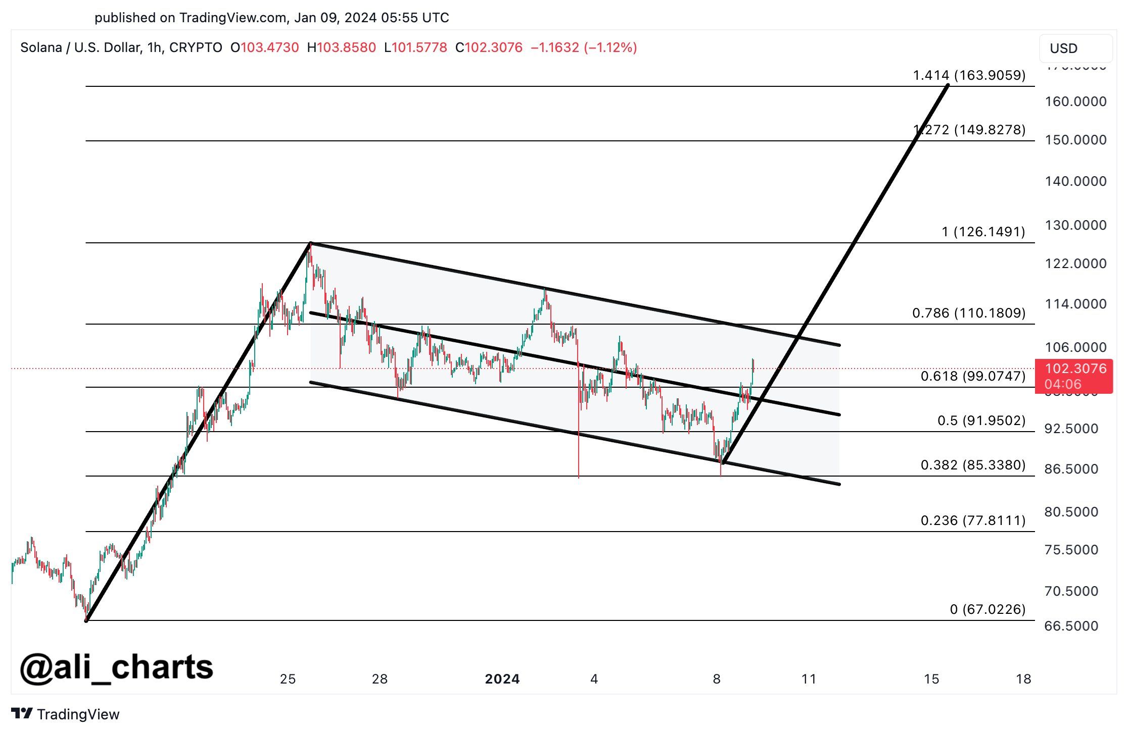 Analyst:innen erwarten eine Fortsetzung des Aufwärtstrends in den kommenden Monaten. Einige Analysten wie “Ali Charts” weisen darauf hin, SOL zeige Anzeichen für die Bildung einer Bullenflagge. Potenzieller Auslöser für einen signifikanten Aufwärtstrend könnte ein entscheidender Schlusskurs über dem Widerstandsniveau von 110 USD sein. Ali sagte in einem Beitrag auf X: