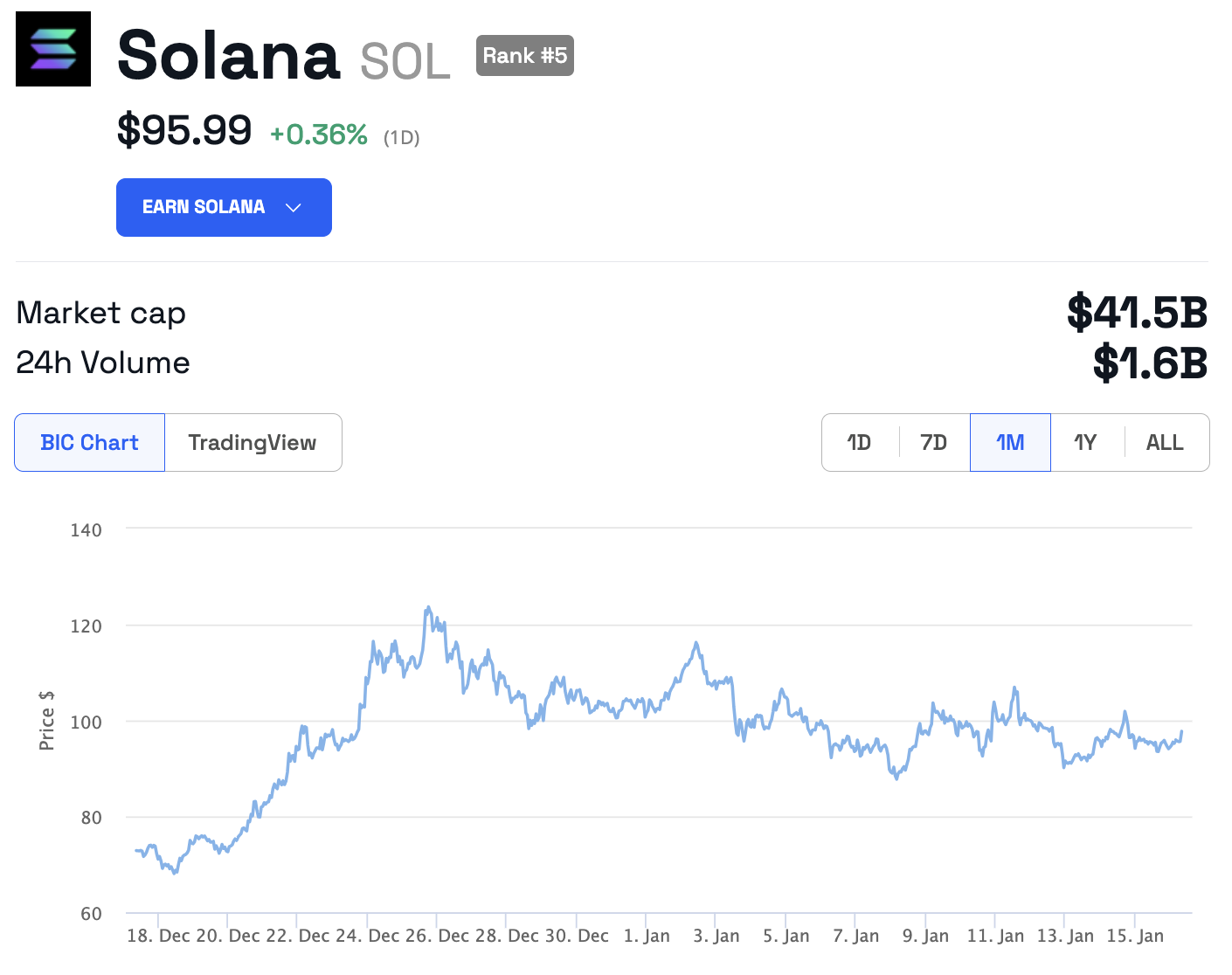 Betrachtet man die Marktperformance, so notiert Solana derzeit bei 95,99 USD mit einem 24-Stunden-Handelsvolumen von 1,6 Milliarden USD. Trotz eines leichten Rückgangs von 1,63 Prozent in den letzten 24 Stunden hat SOL im vergangenen Jahr ein außergewöhnliches Wachstum von über 1.000 Prozent verzeichnet.