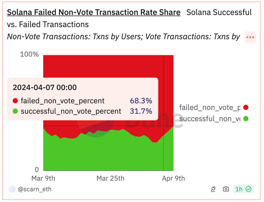 Am 4. April scheiterten über 75 Prozent der Transaktionen, hauptsächlich aufgrund extrem hohen Interesses an Memecoins. Laut Dune Analystics ist diese Zahl seitdem allerdings auf 68,3 Prozent gefallen.