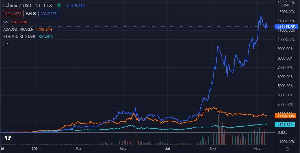 Am 2. November 2021 überholte Solana die Marktkapitalisierung von Cardano. Das ist dahingehend wichtig, da es sich bei beiden Krypto-Projekten um mögliche Anwärter auf Ethereums Thron handelt. Denn sowohl Cardano als auch Solana ermöglichen die Nutzung der Smart Contracts für die Erstellung von DApps (dezentralen Anwendungen) und vielem mehr.