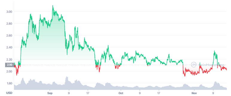 Seit der Einführung der Smart Contracts mit dem Alonzo Upgrade ist beim Cardano Kurs nicht mehr viel passiert. Der ADA Kurs rangiert um die 2 USD-Marke und konnte Anfang September ein Allzeithoch bei knapp 3 US-Dollar ausbilden.