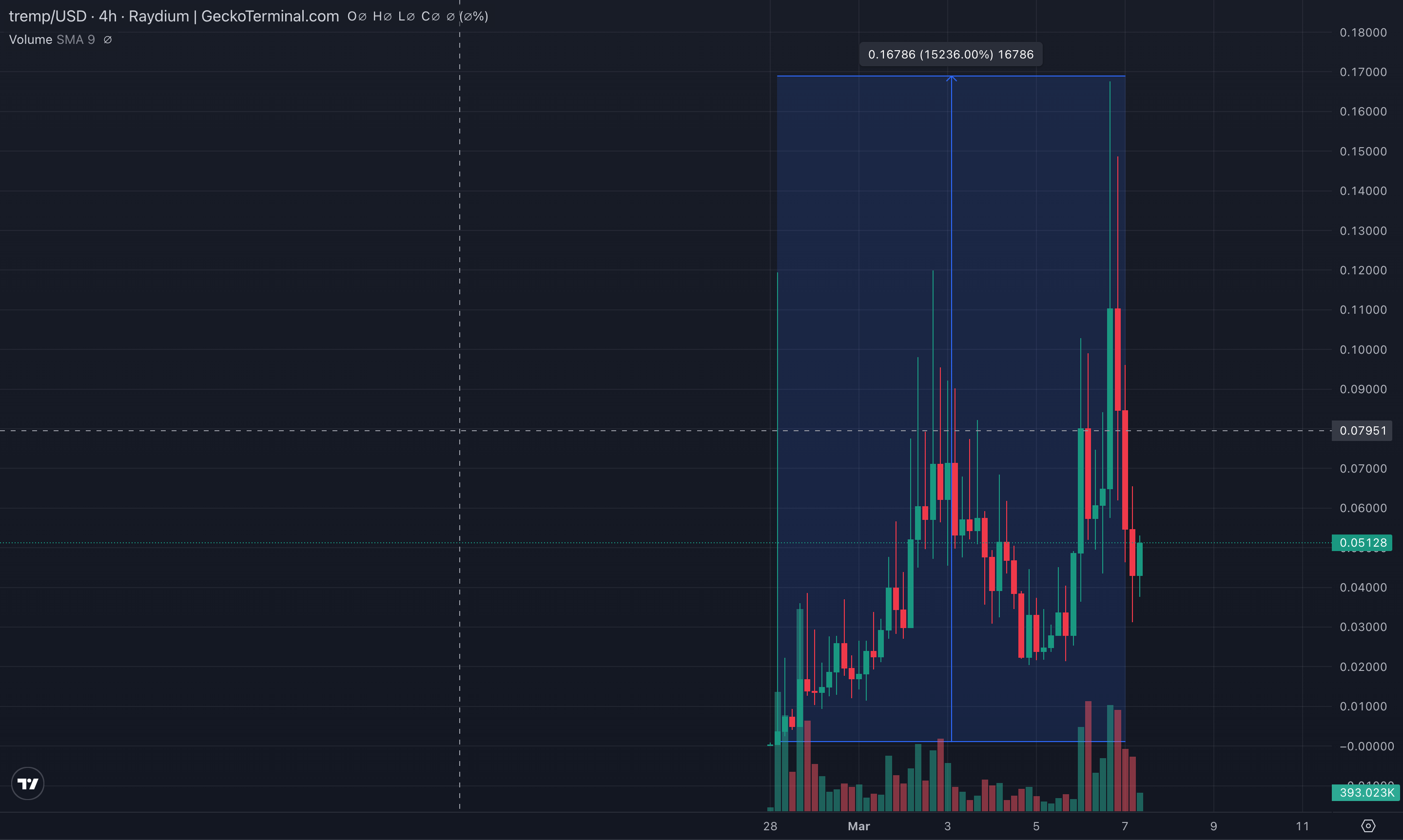 So kann sich nicht nur Joe Biden einer eigens ihm gewidmeten Kryptowährung erfreuen. Auch Donald Trump, oder wie sein Krypto Alter Ego heißt: Doland Tremp, ist vertreten – allerdings schon seit dem 28. Februar. In dieser kurzen Zeit legte der Memecoin einen sagenhaften, wenn auch kurzzeitigen, Anstieg um etwa 15.236 Prozent hin.