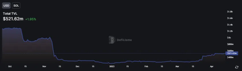 Wie anfangs erwähnt, blieb Solanas DeFi ebenso wenig von diesen Rückschlägen verschont. So beträgt das Total Value Locked (TVL) laut DeFiLlama aktuell lediglich 519 Millionen US-Dollar. Seit dem FTX Drama hat sich der Wert also halbiert und liegt aktuell 95 % unter dem Allzeithoch (ATH) von 10 Milliarden USD im November 2021.