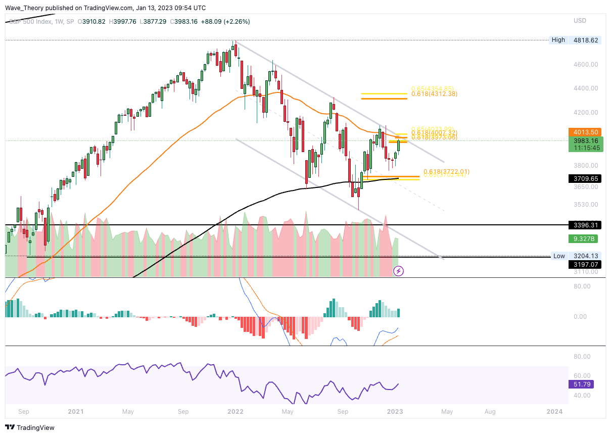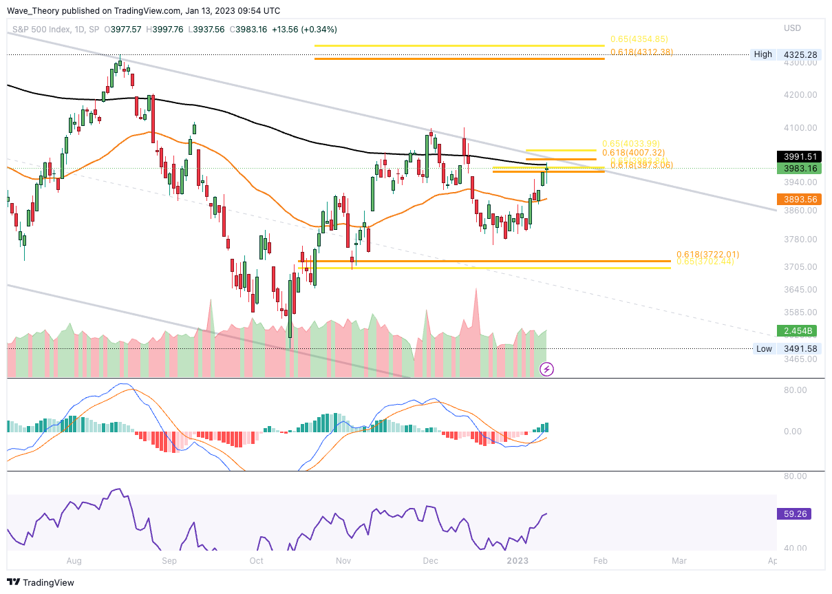 Der S&P500 stößt jetzt auf signifikanten Widerstand am 200-Tage-EMA bei rund 4.000. Dort verlaufen zudem zwei Golden Ratio Widerstände. Bricht SPX diese Widerstände, so erfolgt ein bullischer Ausbruch aus dem parallelen Abwärtskanal. Der Bärentrend könnte damit gebrochen werden und SPX könnte das Allzeithoch anvisieren.