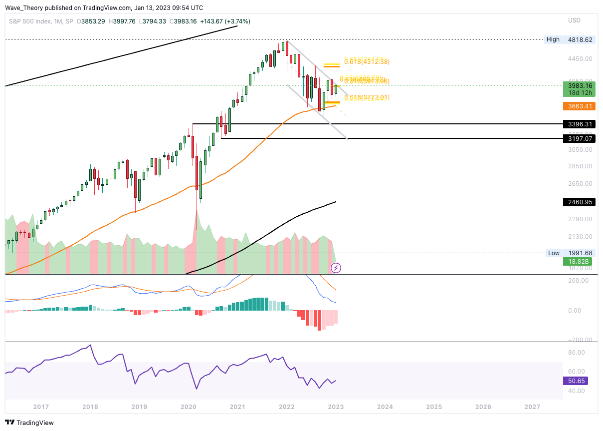 Dort wird entschieden, ob der Bärentrend fortgesetzt wird oder SPX zum Bullentrend zurückkehrt. Denn eine bärische Abweisung am Golden Ratio Widerstand bei rund 4.350 könnte den SPX mittelfristig zum 50-Monate-EMA bei rund 3.660 drücken. Sollte SPX auch diese Unterstützung brechen, wartet erst wieder zwischen rund 3.200 und 3.400 signifikante Unterstützung auf den S&P500.