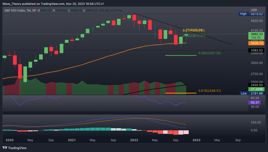 In der letzten S&P500 Kurs Prognose schrieben wir: “Der SPX Kurs konnte nun am 50-Monate-EMA abprallen und stieg in Zuge dessen schon rund 9 %. Damit findet der SPX Kurs jetzt am 0,382 Fib Niveau bei rund 3.814 signifikanten Widerstand. Sollte der S&P500 diesen Widerstand brechen, wartet bei rund 4.010 der nächste signifikante Fib Widerstand.