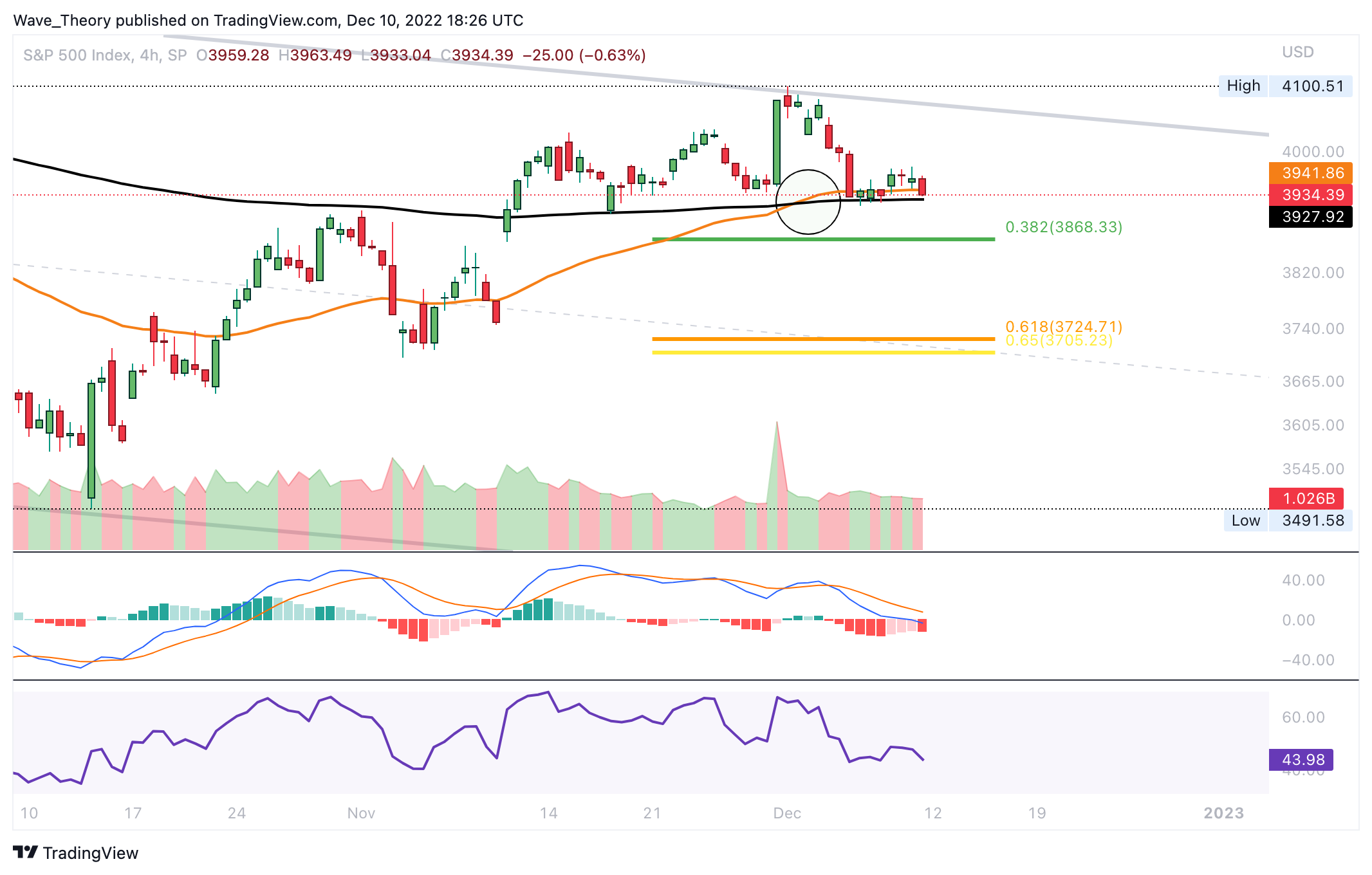 Im Wochenchart wird ersichtlich, dass sich der SPX Kurs noch immer in einem parallelen Abwärtskanal befindet. Zudem deutet die bärische Abweisung am 50-Wochen-EMA Widerstand bei rund 4.042 auf eine Fortsetzung der Abwärtsbewegung hin.