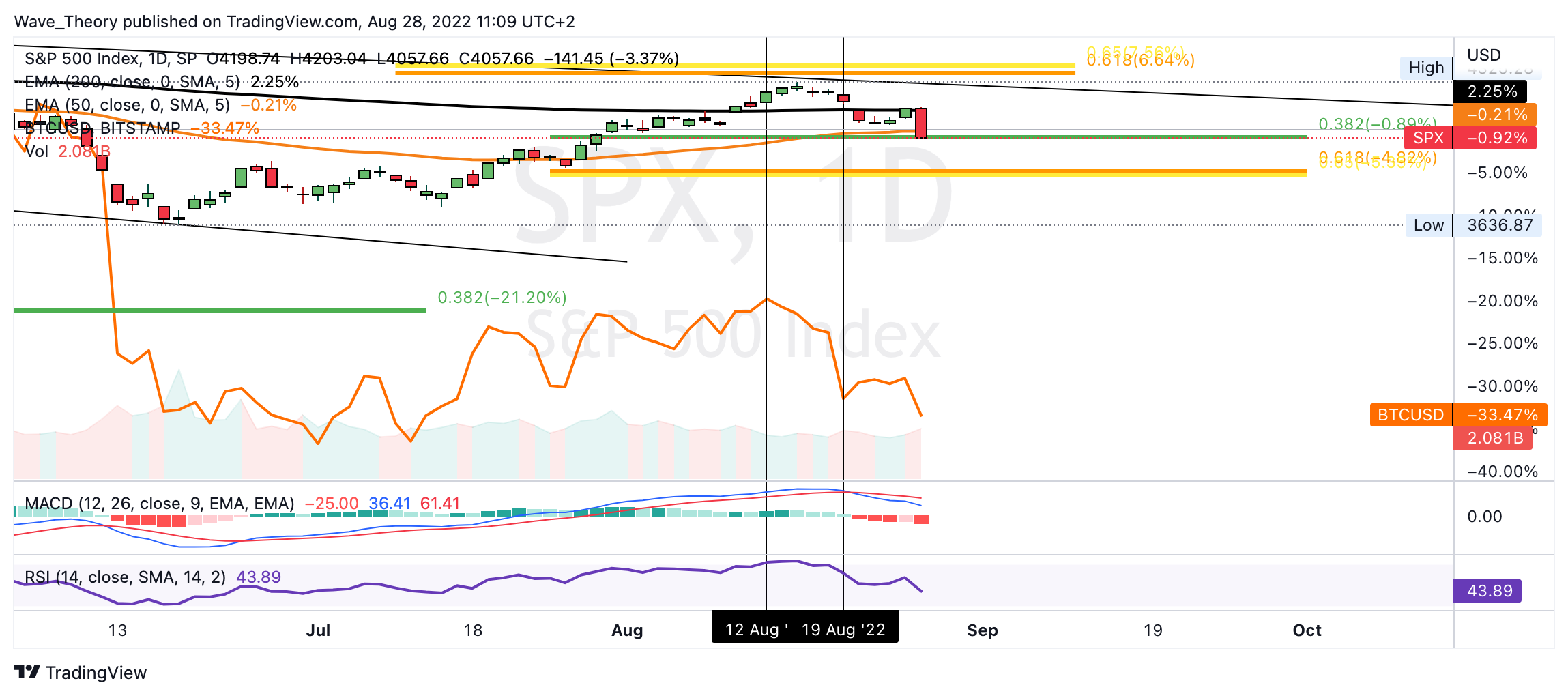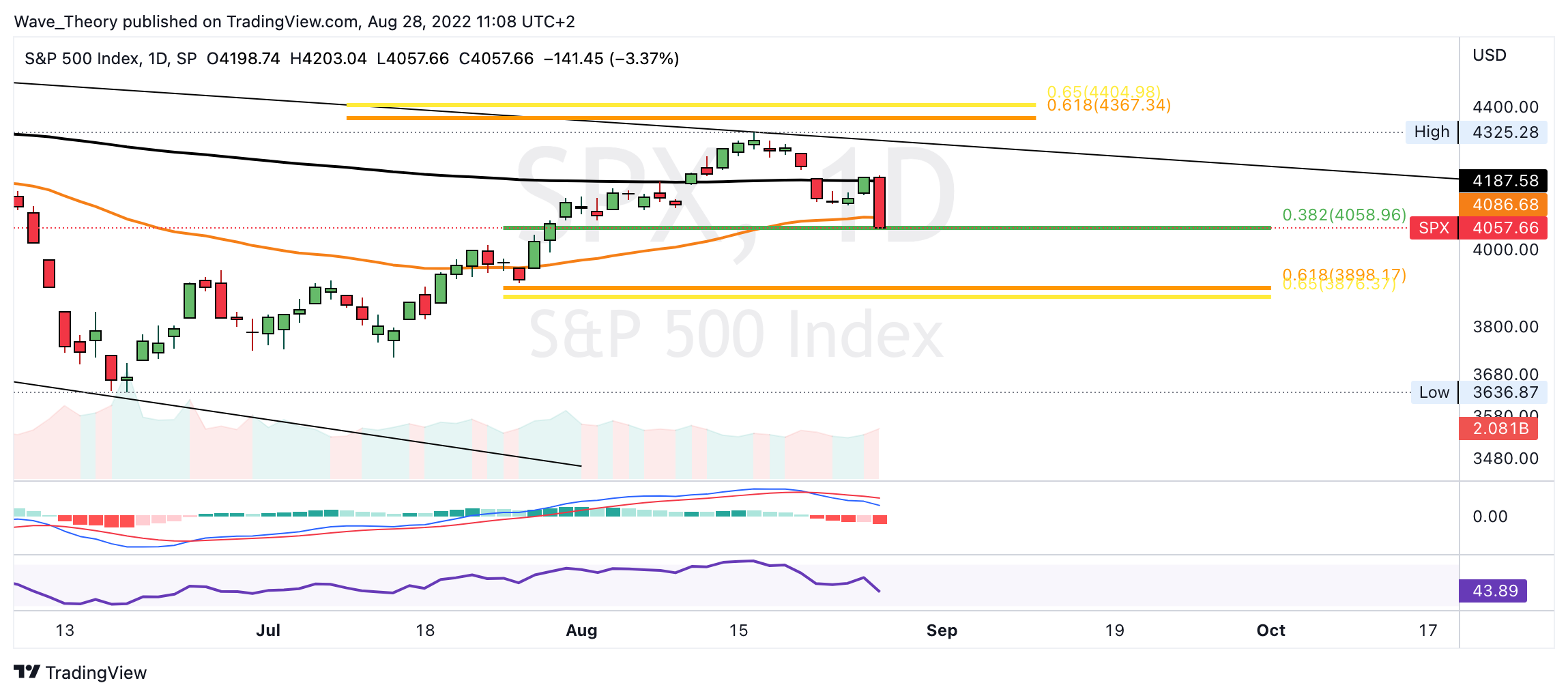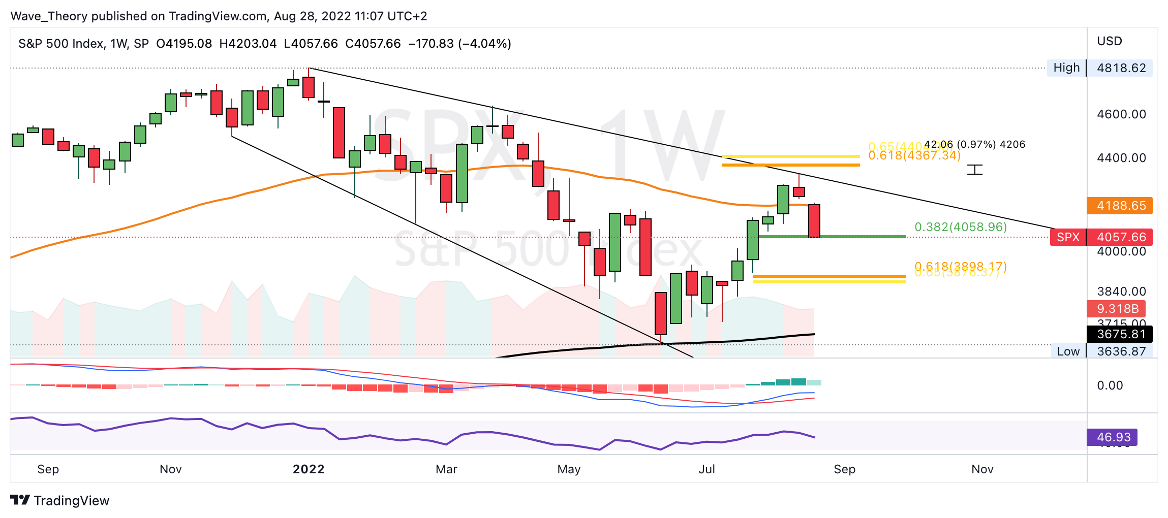 Das Histogramm des MACDs tickt diese Woche aber bereits bärisch tiefer und in wenigen Stunden wird die Woche schließen. Sollte der SPX Kurs die 0,382 Fib Unterstützung bei rund 4.060 bärisch brechen, könnte der S&P 500 Kurs auf rund 3.900 fallen. Dort stößt SPX auf signifikante Fibonacci Unterstützung.