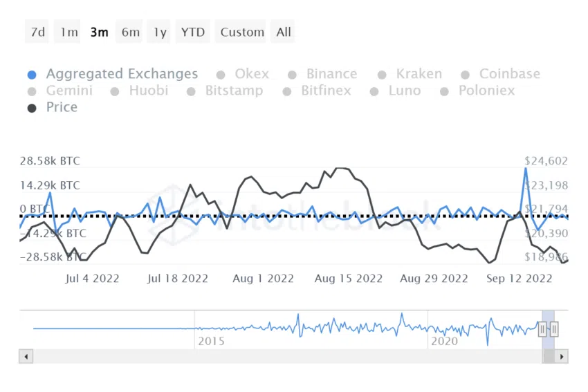 Die im August weitgehend positiven Nettokapitalflüsse von Bitcoin an den vertretenen Börsen zeigt die anhaltende Unsicherheit der Anleger. Nettokapitalflüsse sind positiv, wenn mehr Mittel in die Börsen fließen als sie verlassen.