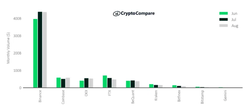 Investoren sowie Trader verhielten sich aufgrund dieser volatilen und unvorhersehbaren Marktsituation wesentlich vorsichtiger als sonst. Besonders deutlich wurde dies an Investitionsmustern und -psychologie der Marktteilnehmer während des gesamten letzten Monats. Wie ein Bericht von CryptoCompare zeigt, erreichte Binance als weltweit führende Kryptowährungsbörse im August einen Marktanteil von 55,1 % des Spotvolumens. Die Marktanteile anderer Spitzenbörsen hingegen blieben gleich.