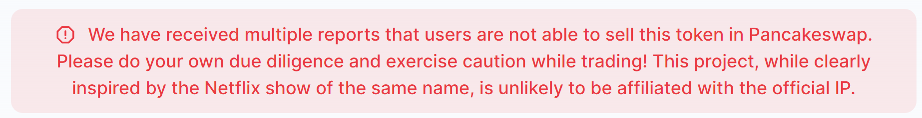 “Wir haben mehrere Berichte erhalten, dass Benutzer nicht in der Lage sind, diesen Token in Pancakeswap zu verkaufen. Bitte wahren Sie Ihre eigene Sorgfaltspflicht und lassen Sie beim Handel Vorsicht walten! Dieses Projekt ist zwar eindeutig von der gleichnamigen Netflix-Serie inspiriert, aber es ist unwahrscheinlich, dass es mit der offiziellen Marke in Verbindung steht.”