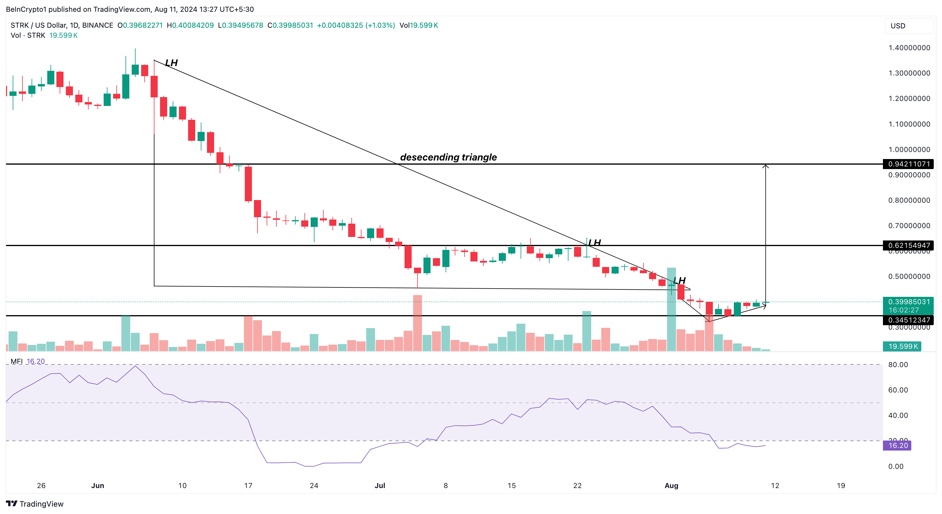 Zum Zeitpunkt der Veröffentlichung handelt der STRK-Kurs bei 0,39 USD, was ihn zu einem der größten Gewinner unter den Top 100 der letzten 24 Stunden macht. Basierend auf dem Tageschart bildete die Kryptowährung ein absteigendes Dreieck zwischen dem fünften Juni und dem dritten August.