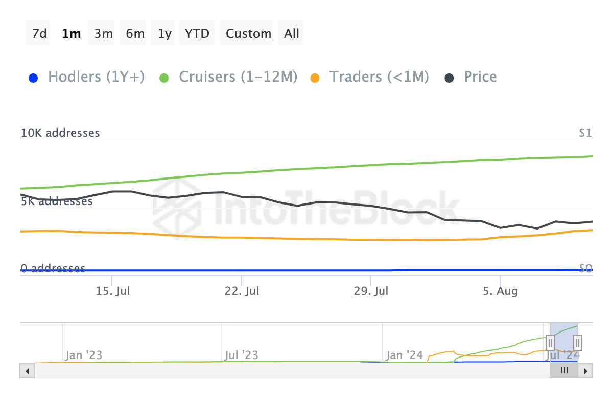Nach der Testnet Ankündigung zeigen Daten von IntoTheBlock einen Anstieg der Adressen, die STRK halten, zwischen den letzten 30 Tagen und den letzten 365 Tagen.