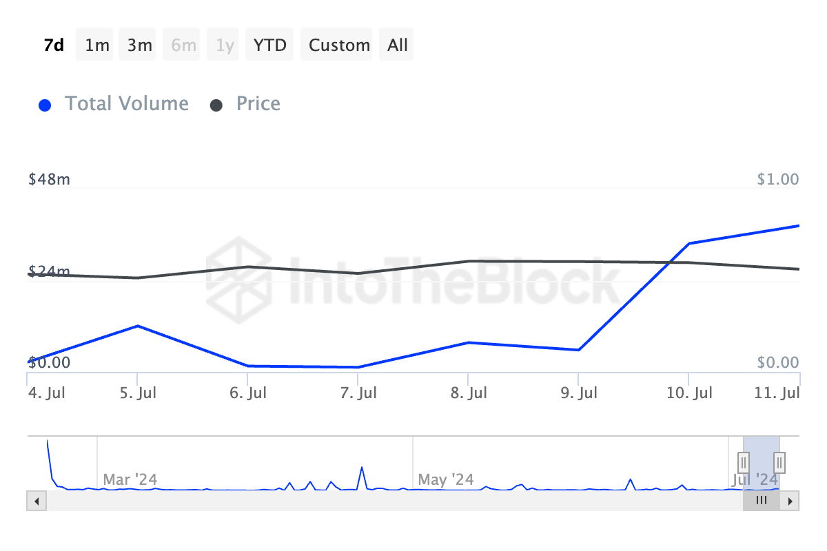 Der gestiegene Bedarf an STRK in der letzten Woche trieb sein tägliches Transaktionsvolumen am 11. Juli auf einen Sieben-Tage-Höchststand von 38,31 Millionen USD. Das entspricht einem Anstieg von 15 Prozent gegenüber dem täglichen Transaktionsvolumen von 33 Millionen USD am Vortag.