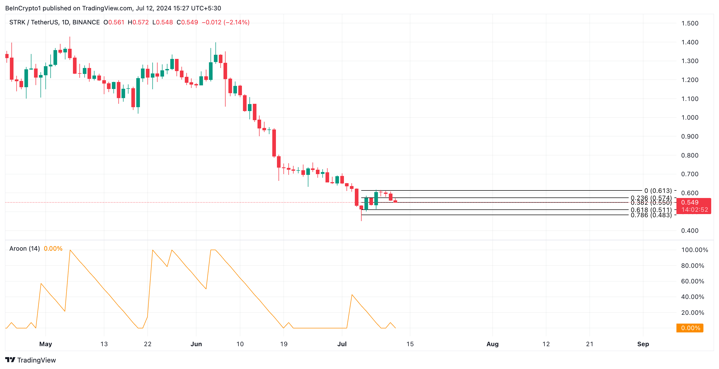 Dies bedeutet, dass STRK-Gefahr läuft, seine jüngsten Gewinne zu verlieren. Sollte dies eintreten, könnte sein Kurs auf 0,51 USD fallen.