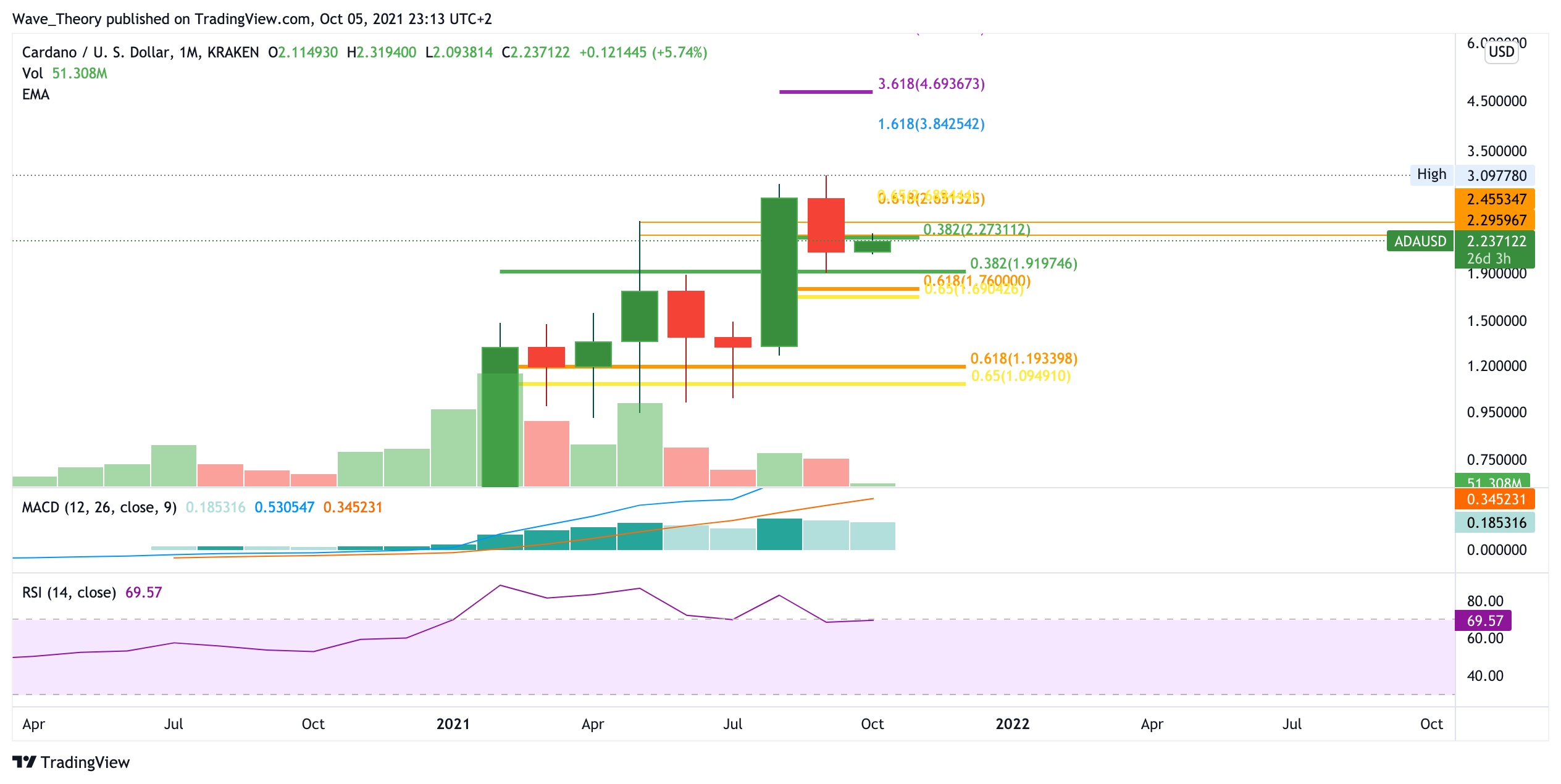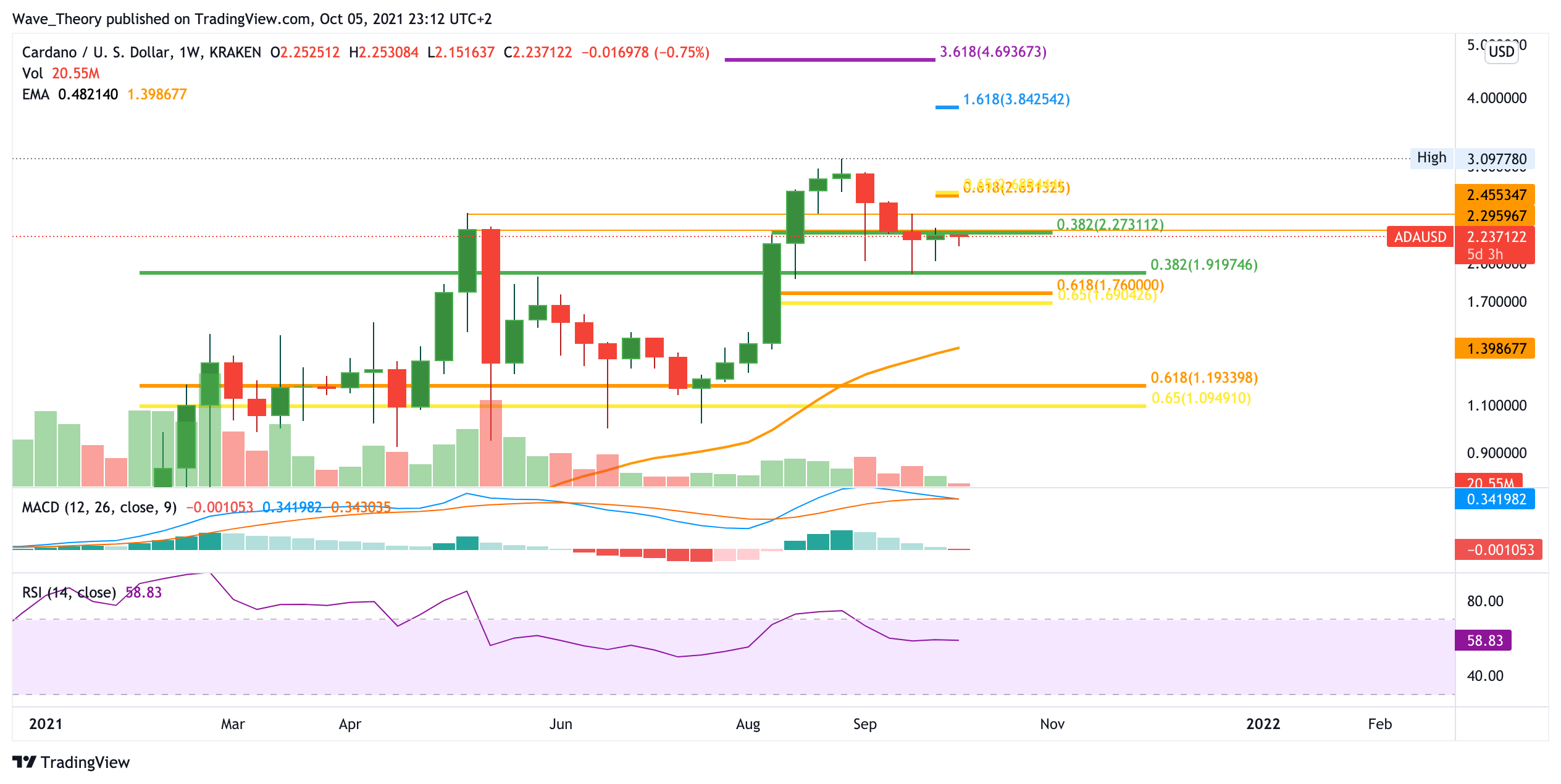 Sollte es Cardano gelingen, die Golden Ratio bei 2,65 USD zu brechen, so könnte er in Zuge dessen auf sein Allzeithoch bei rund 3,1 USD klettern. Wird dieses Preisniveau ebenfalls übertroffen, so findet der Cardano Kurs erst wieder bei 3,84 und bei 4,7 USD signifikante Widerstände. Der wöchentliche MACD gibt aber keine bullischen Signale. Stattdessen tickt das Histogram bärisch nach unten während sich die MACD Linien bärisch überkreuzen.