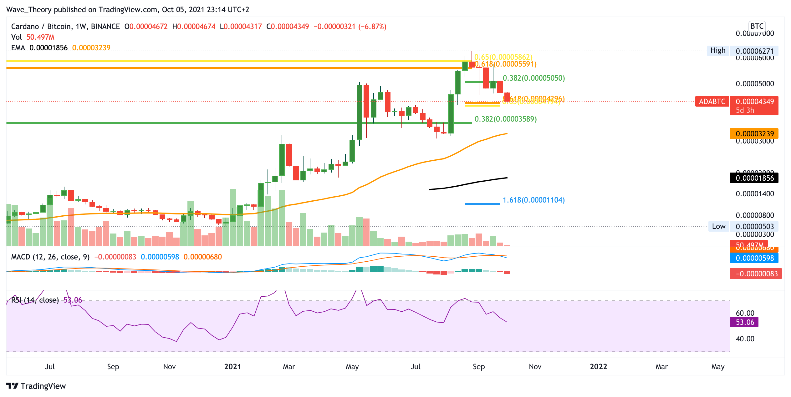 Gegen BTC wurde ADA an der Golden Ratio bei 0,000056 BTC abgewiesen. Seither befindet sich der ADA Kurs seit einigen Wochen im Abwärtstrend. Aktuell stößt der ADA/BTC Kurs auf Unterstützung an der Golden Ratio bei 0,000043 BTC. Dort könnte Cardano sehr stark abprallen, um erneut den Versuch zu unternehmen, den Widerstand bei 0,000056 BTC zu brechen. Andernfalls findet er erst wieder zwischen dem 50-Wochen-EMA bei 0,000032 BTC und dem 0,382 Fib Niveau bei 0,000036 BTC Unterstützung.