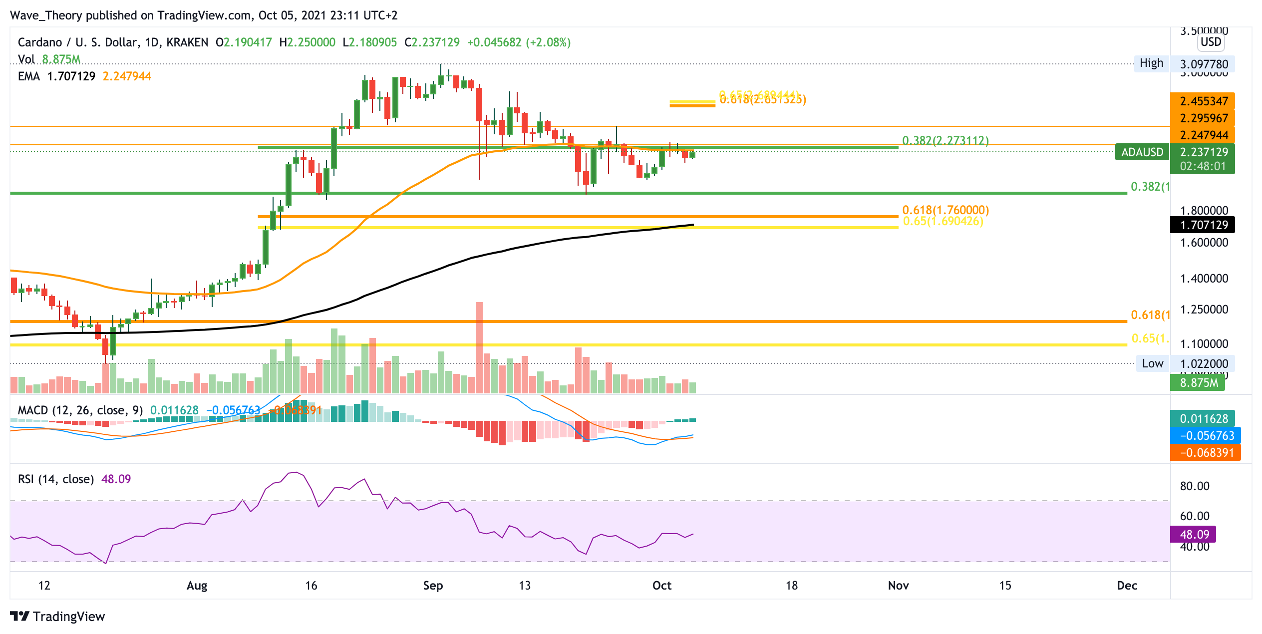 Der ADA Preis konnte stark an der Fibonacci Unterstützung bei 1,91 USD abprallen, womit der Cardano Kurs aktuell mit dem 50-Tage-EMA Widerstand bei 2,25 USD kämpft. Genau dort befindet sich zudem ein Fibonacci Widerstand. Sollte dieses Fib Niveau nun gebrochen werden, findet Cardano bei 2,65 USD seinen nächsten Widerstand. Der MACD zeigt sich im Tageskurs aktuell bullisch. Angesichts der bullischen Entwicklung des Kryptomarktes, könnte Cardano Anschluss finden und auf 2,65 USD steigen.