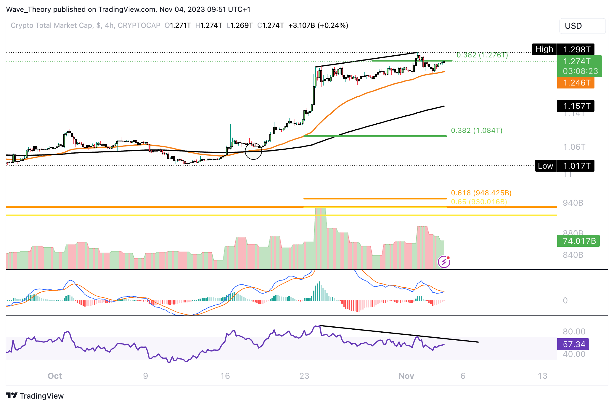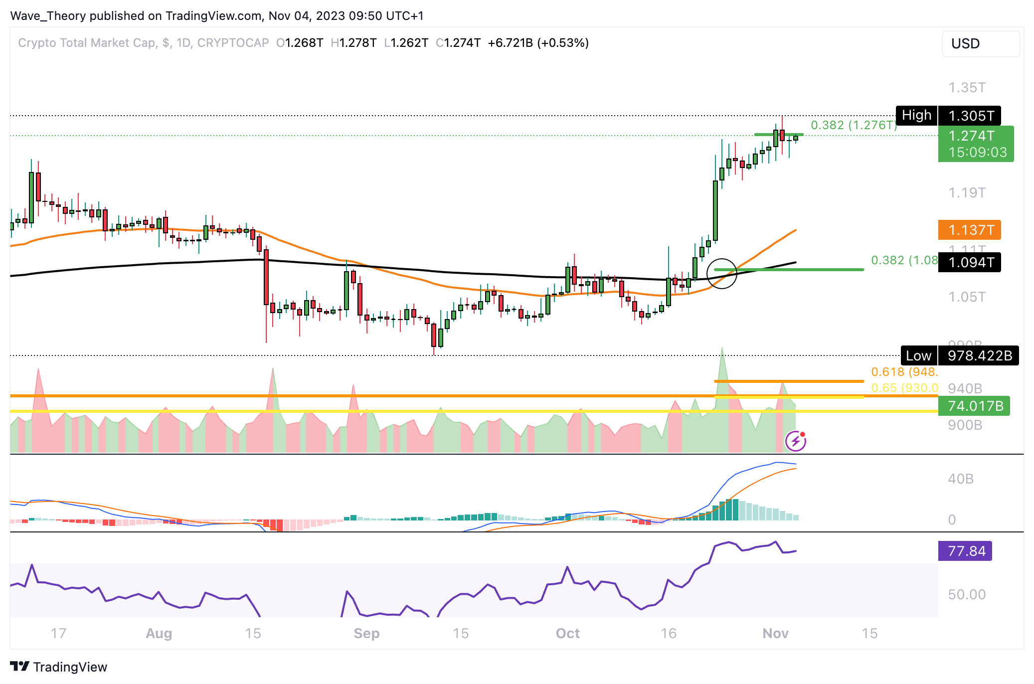 Der Krypto-Markt könnte um 30 % steigen, um den Golden Ratio Widerstand bei rund 1,615 Billionen USD zu erreichen. Dafür muss der Kurs den 0,382 Fib Widerstand bei rund 1,276 Billionen USD brechen.