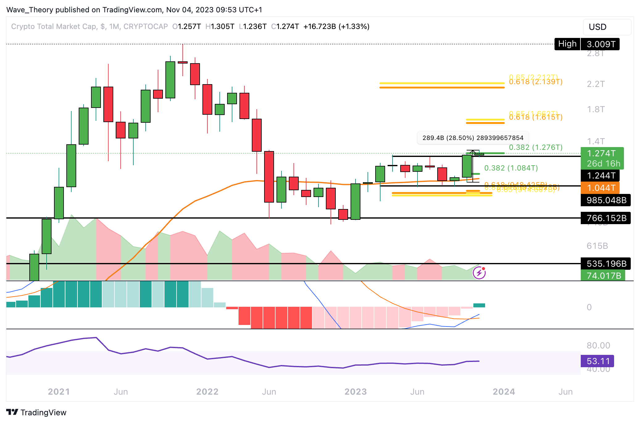 Da die Marktkapitalisierung letzten Monat aber fast 30 % steigen konnte und der Krypto-Markt kurz davor ist, den 0,382 Fib Widerstand bei rund 1,276 Billionen USD zu brechen, könnte der Krypto-Markt den Aufwärtstrend in diesem Monat fortsetzen.