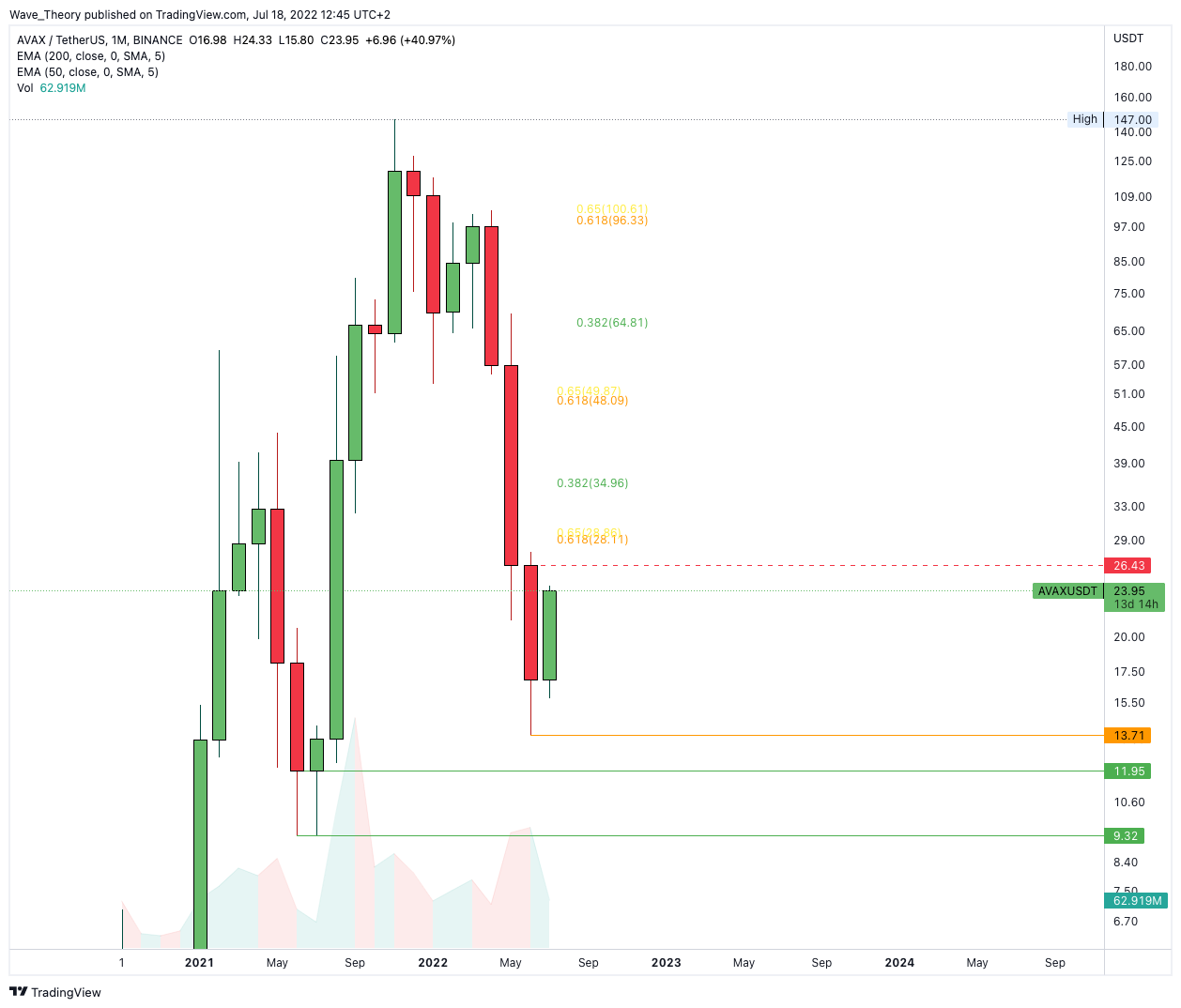 Sollte AVAX in diesem Monat weiter steigen und dabei in diesem Monat über 26,43 USD schließen, läge damit eine bullische Kerzenformation im Monatschart vor. Damit stünde eine Fortsetzung der Aufwärtsbewegung in Aussicht.