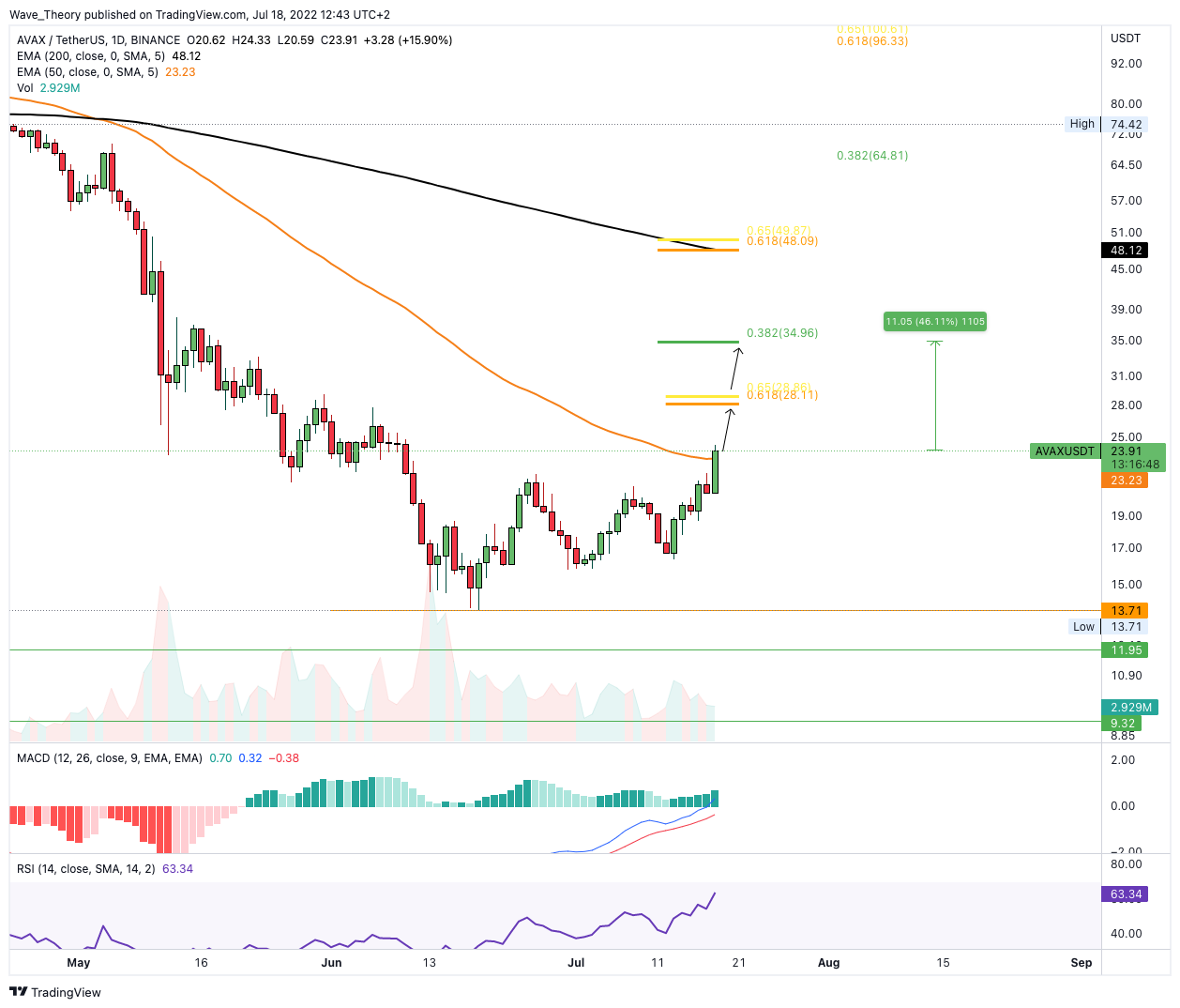 Das impliziert ein Aufwärtspotenzial von rund 46 % und sollte AVAX beide Fibonacci Widerstände brechen, könnte AVAX sogar bis zur Golden Ratio bei der 50 USD Marke steigen. Dort stößt AVAX zudem auf den 200-Tage-EMA, welcher als zusätzlicher Widerstand fungiert.