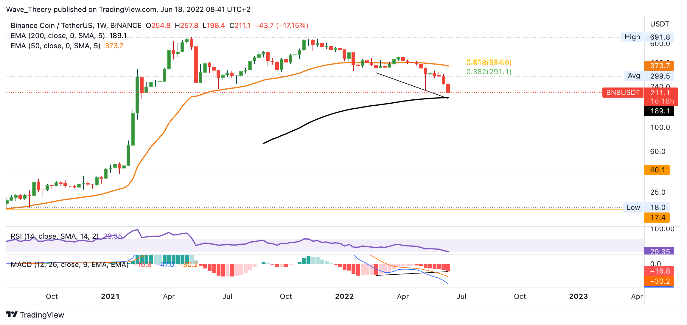 Bricht der BNB Kurs den 200-Wochen-EMA bei 189 USD, wartet bei rund 160 USD die nächste signifikante Unterstützung auf BNB, denn dort stößt BNB auf den 50-Monate-EMA.