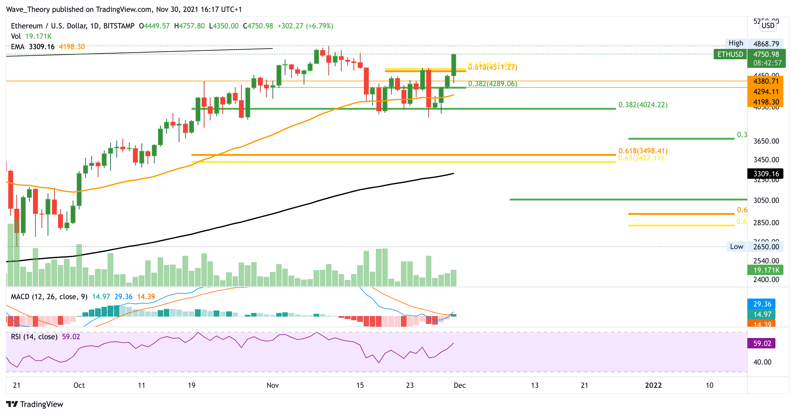 Im Wochenkurs wird sehr deutlich, wie bullisch der ETH Kurs letzte Woche am Fibonacci Niveau bei 4.000 USD abprallen konnte. Diese Woche startet der ETH Kurs umso bullischer und mit 4.700 USD ist der ETH Preis nur noch wenige Dollar vom ATH entfernt. Im Wochenkurs entwickelt sich das Histogramm des MACDs zudem aktuell wieder bullisch.