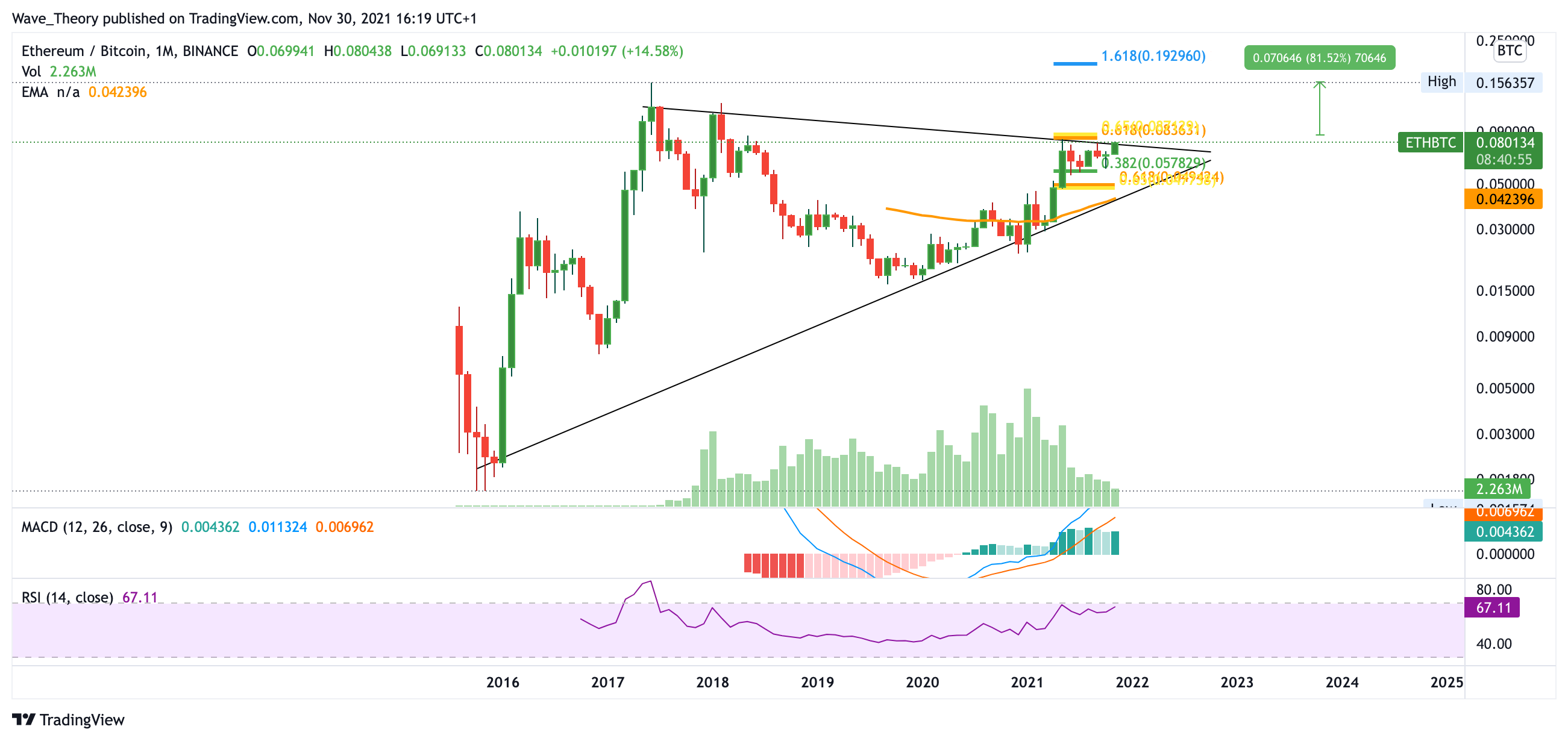 Der Ethereum Kurs befindet sich aktuell in einem bullischen Momentum und ist kurz davor, bullisch auszubrechen. Seit Monaten hat der Kurs das symmetrische Dreieck nicht verlassen, doch nun könnte sich dies ändern. Sollte der Ethereum Kurs den Widerstand bei 0,085 BTC brechen, so könnte erneut das Allzeithoch bei rund 0,16 BTC erreicht werden. Dies würde nach dem Bruch der Golden Ratio bei 0,085 BTC ein Aufwärtspotenzial von rund 80% bedeuten – und das gegen Bitcoin! Sollte Bitcoin in der gleichen Zeit ebenfalls steigen, könnte das den Ethereum Kurs gegen den US-Dollar massiv in die Höhe treiben.