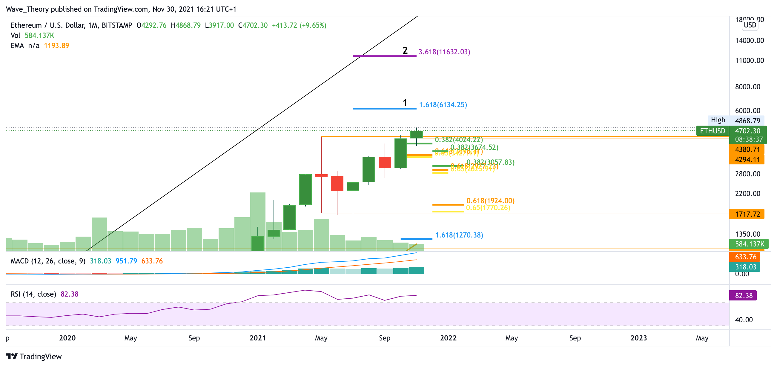 Sollte der ETH Kurs nun das Allzeithoch überwinden und zusätzlich gegen Bitcoin bullisch ausbrechen, so könnte Ethereum in kürzester Zeit auf das nächste Fibonacci Level bei rund 6.000 USD steigen. Bricht Ethereum dieses ebenfalls, könnte Ethereum einen zweistelligen fünfstelligen Preis erreichen und auf rund 11.000 USD klettern.
