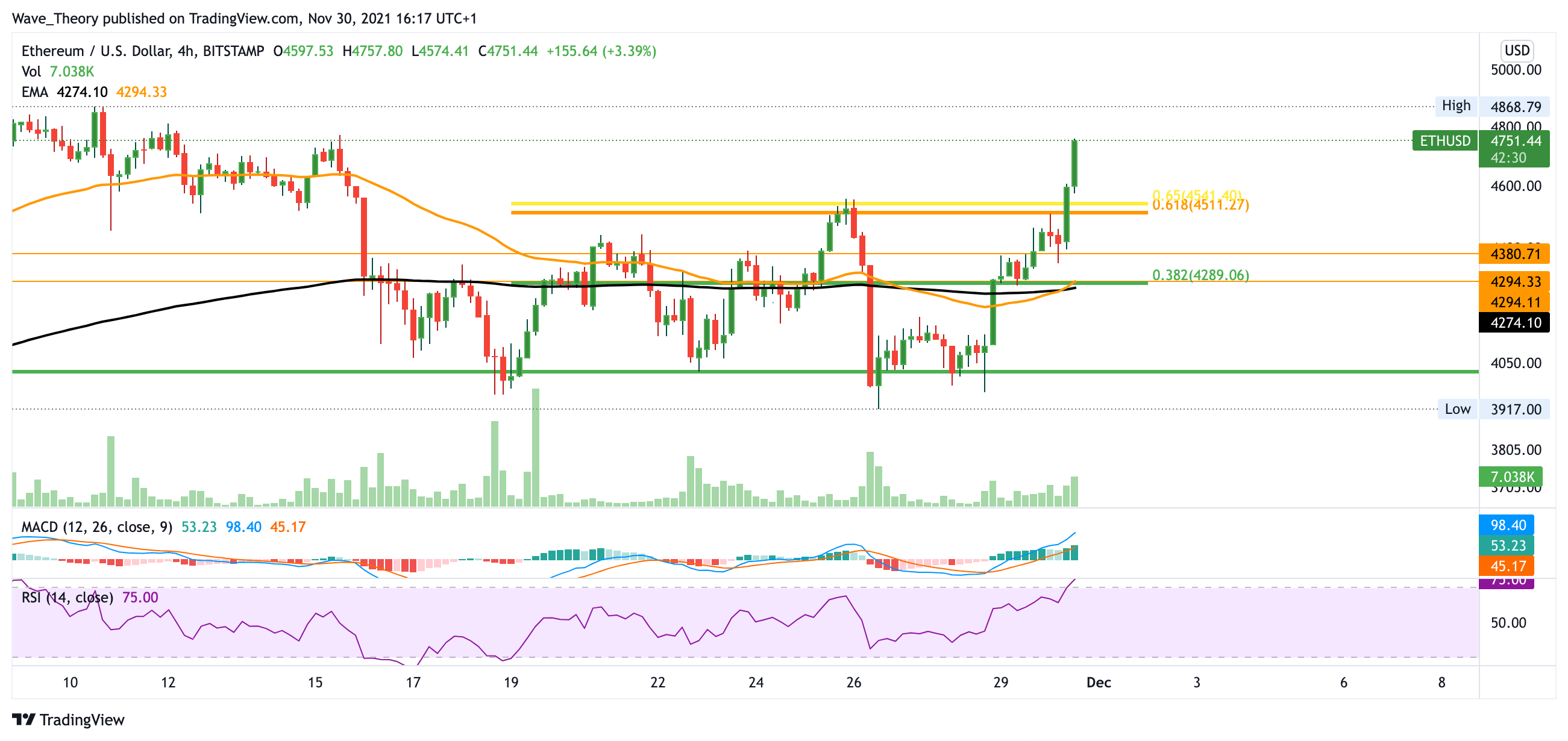 Seit Ethereum die Unterstützung bei rund 4.000 USD erreichte, hat der Ethereum Kurs einen starken Anstieg hingelegt. Zunächst stieg der ETH Kurs zum Golden Ratio Widerstand bei rund 4.500 USD. Dort prallte der Kurs sehr stark ab und kehrte zur Fib Unterstützung bei 4.000 USD zurück. Doch diese signifikante Unterstützung konnte erfolgreich gehalten werden und der Ethereum Kurs befindet sich seither in einer kontinuierlichen Aufwärtsbewegung. Dabei konnte sowohl der horizontale Widerstand bei rund 4.300 USD als auch die Golden Ratio bei rund 4.500 USD zurückgelassen werden. Somit ist der ETH Preis fast schon wieder auf dem Allzeithoch bei rund 4.900 USD. Auch der MACD entwickelt sich im Tageskurs stark bullisch – das Histogramm bewegt sich nach oben und die MACD Linien haben sich erst kürzlich bullisch überkreuzt. Den nächsten Widerstand findet der ETH Kurs also erst wieder am ATH bei rund 4.900 USD.