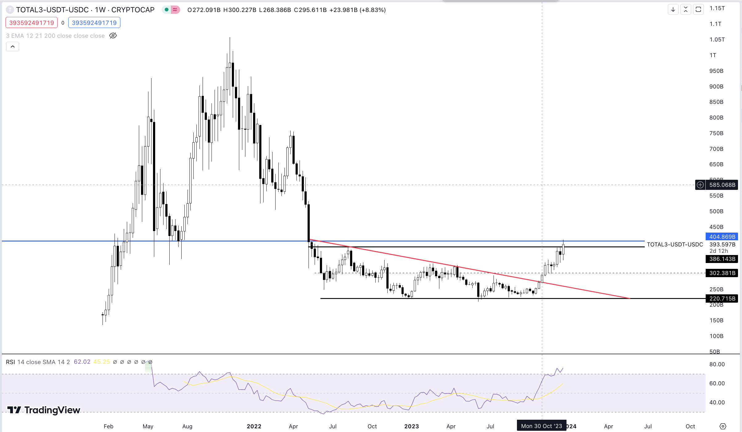 Das folgende Diagramm zeigt das TOTAL3, allerdings auch ohne die Stablecoins USDT und USDC, um möglichst unverfälschte Daten zu erhalten. Wie hier deutlich wird, sind die Altcoins nicht nur mit kräftigem Momentum aus ihrem Abwärtstrend ausgebrochen, sondern scheinen auch den Widerstand bei etwa 386 Milliarden USD zu durchbrechen.