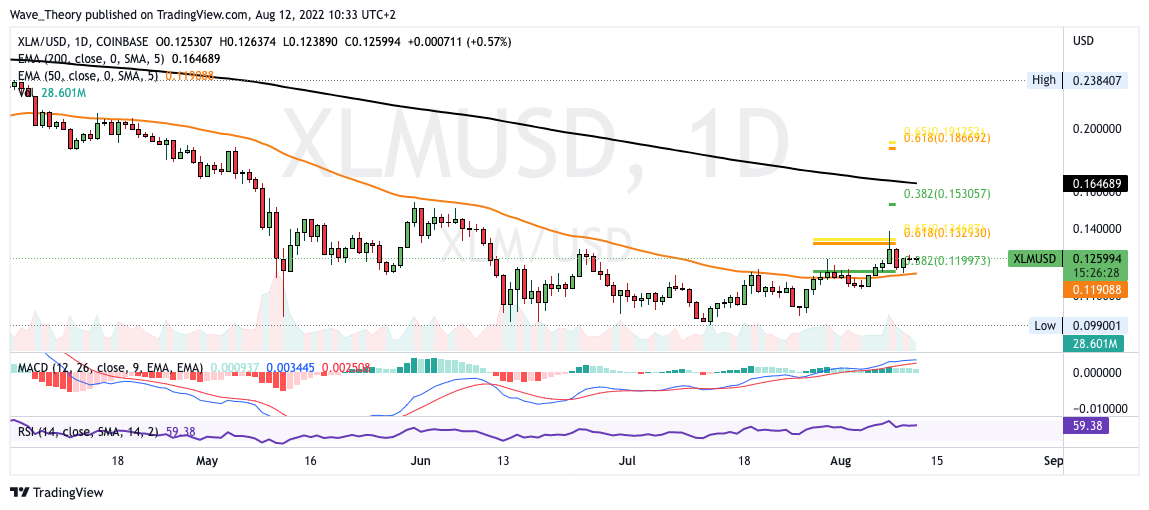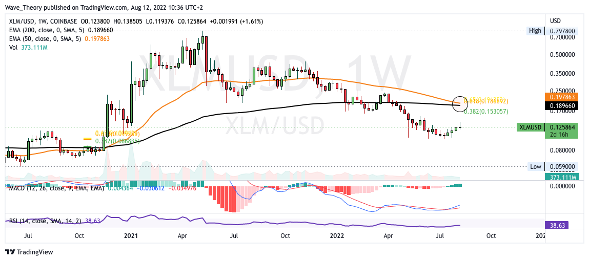 Bricht Stellar Lumens den Golden Ratio Widerstand, wartet zwischen 0,153 und 0,165 USD der nächste signifikante Widerstand auf Stellar, denn dort stößt Stellar auf den 0,382 Fib Widerstand und den 200-Tage-EMA.